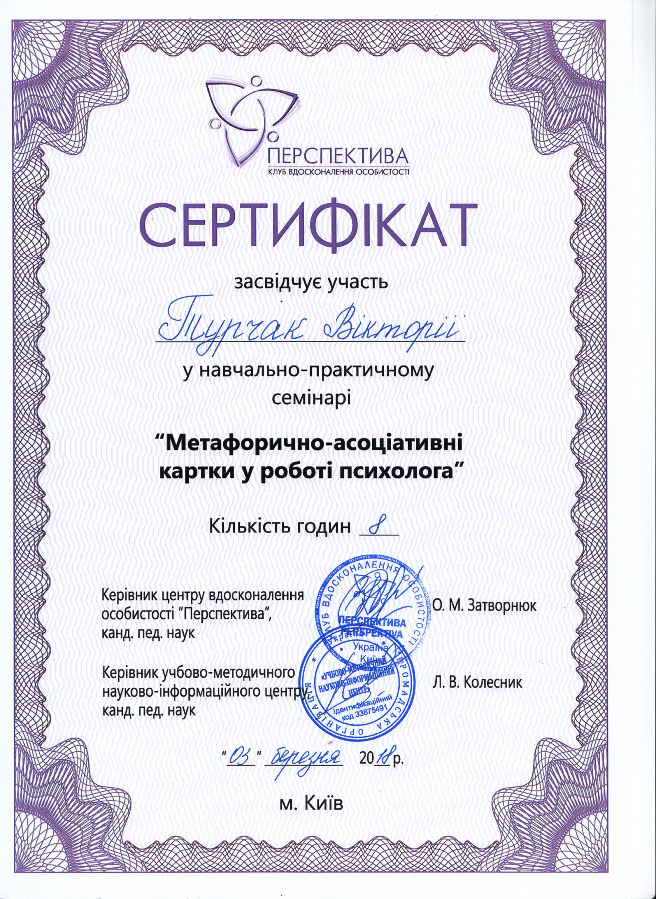 - Сертифікат Метафоричні асоціативні картки у роботі психолога з 2018 року