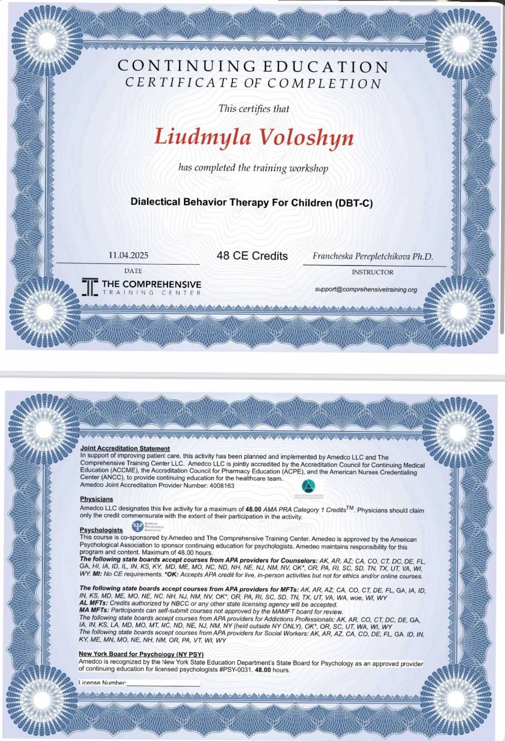 - Сертифікат Діалектико-поведінкова терапія для дітей та підлітків з 2025 року