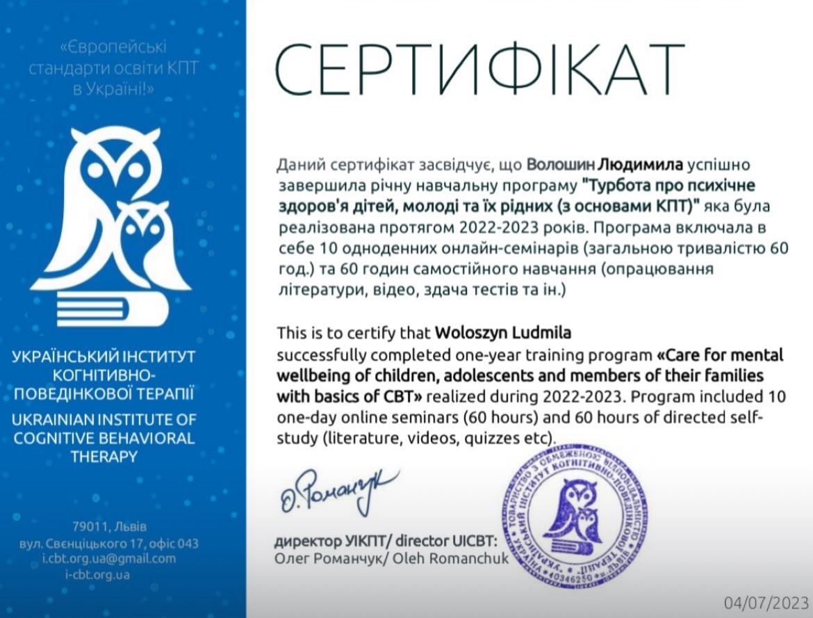 - Сертифікат Терапія прийняття та відповідальності з 2024 року