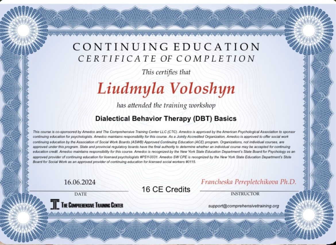 - Сертифікат Діалектико-поведінкова терапія з 2024 року