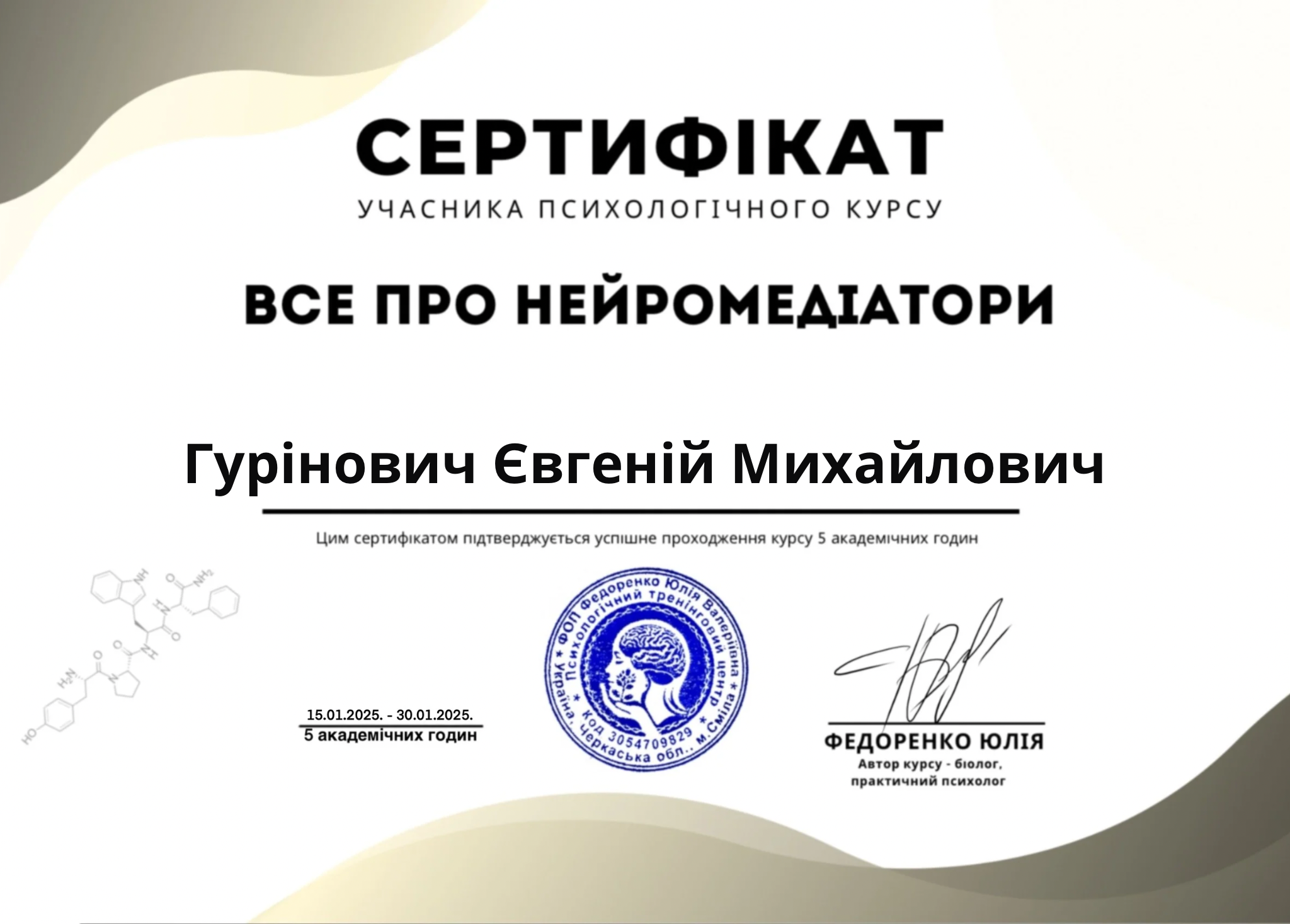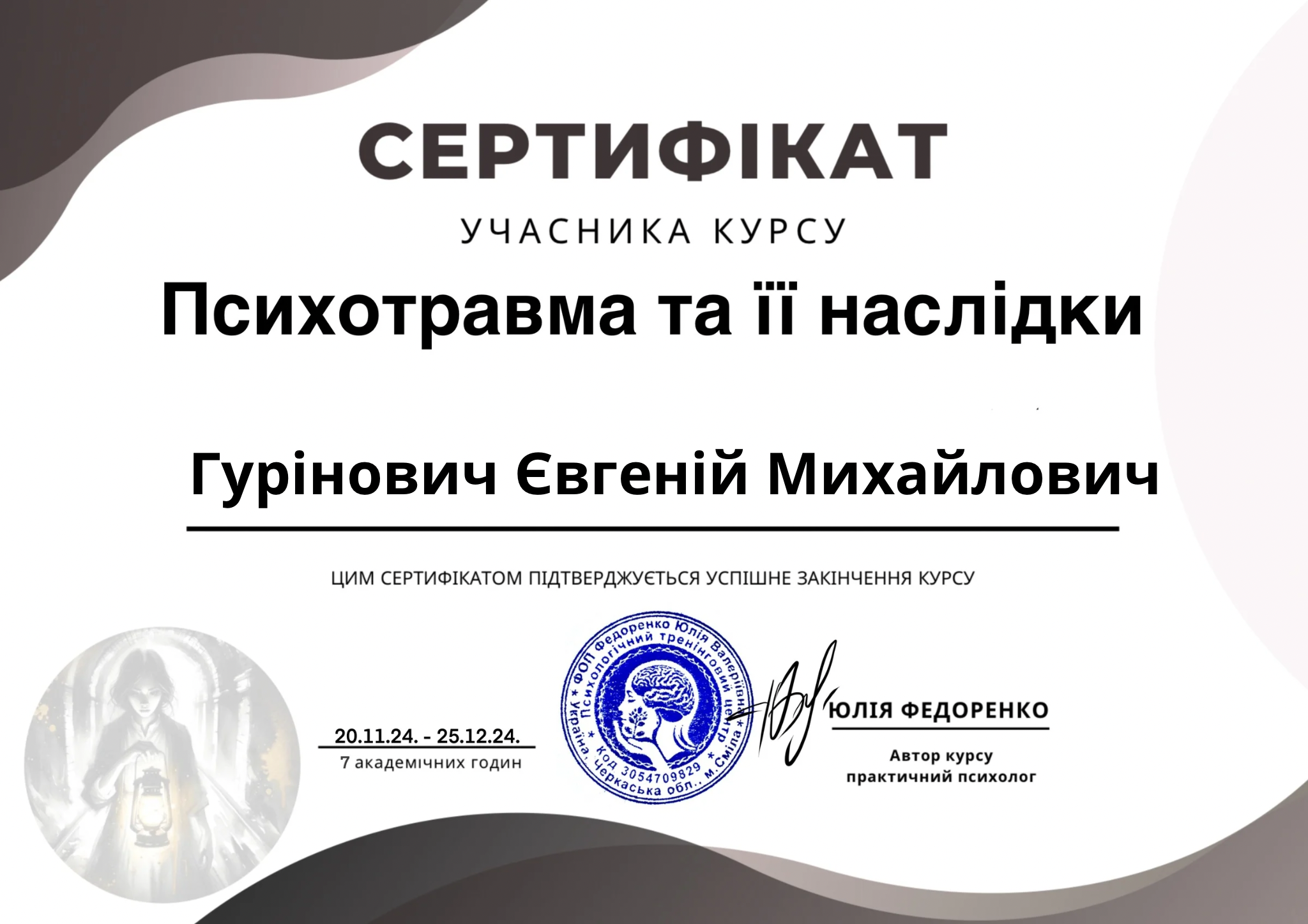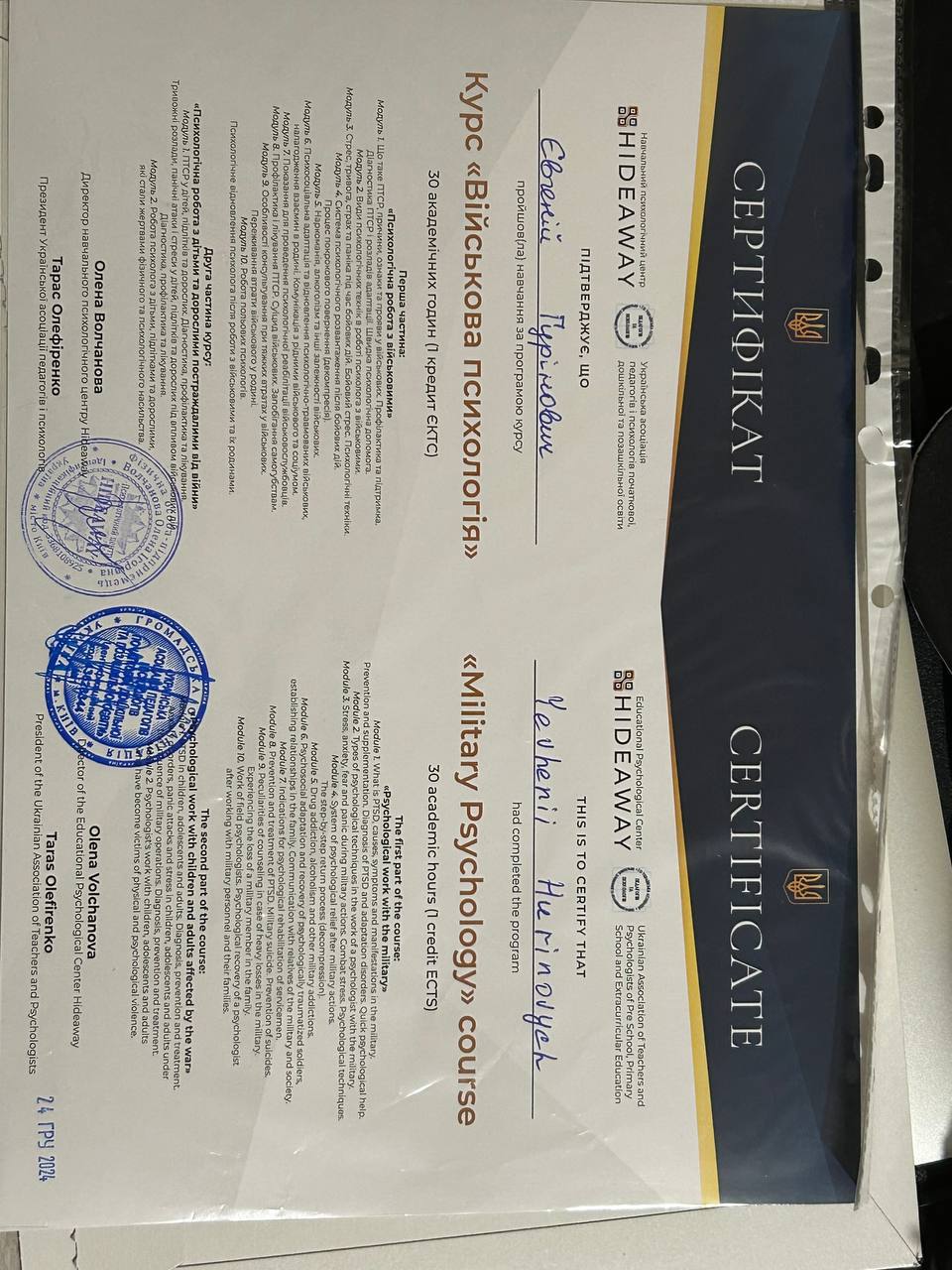 - Сертифікат Проходження курсу Військова психологія" з 2024 року