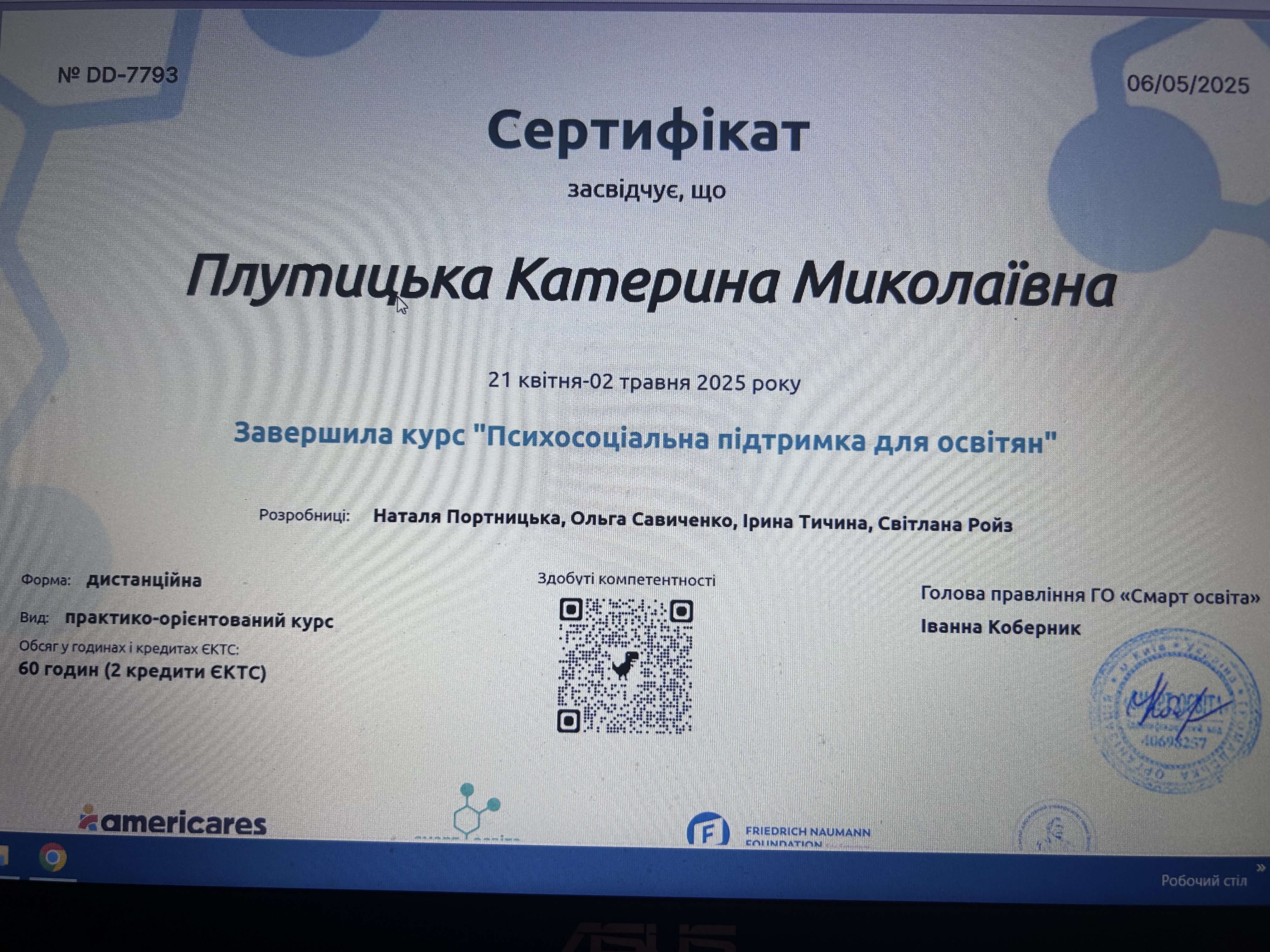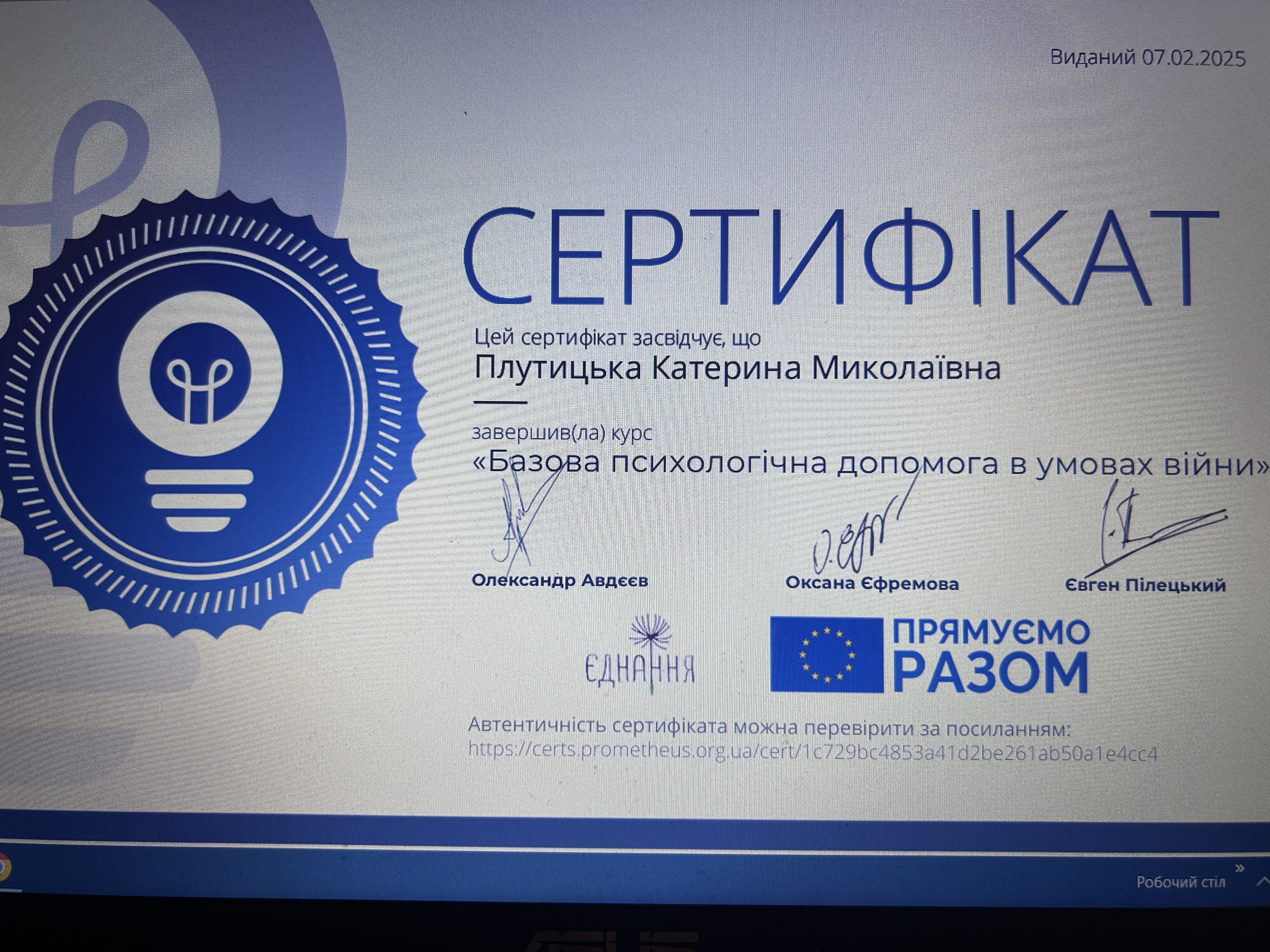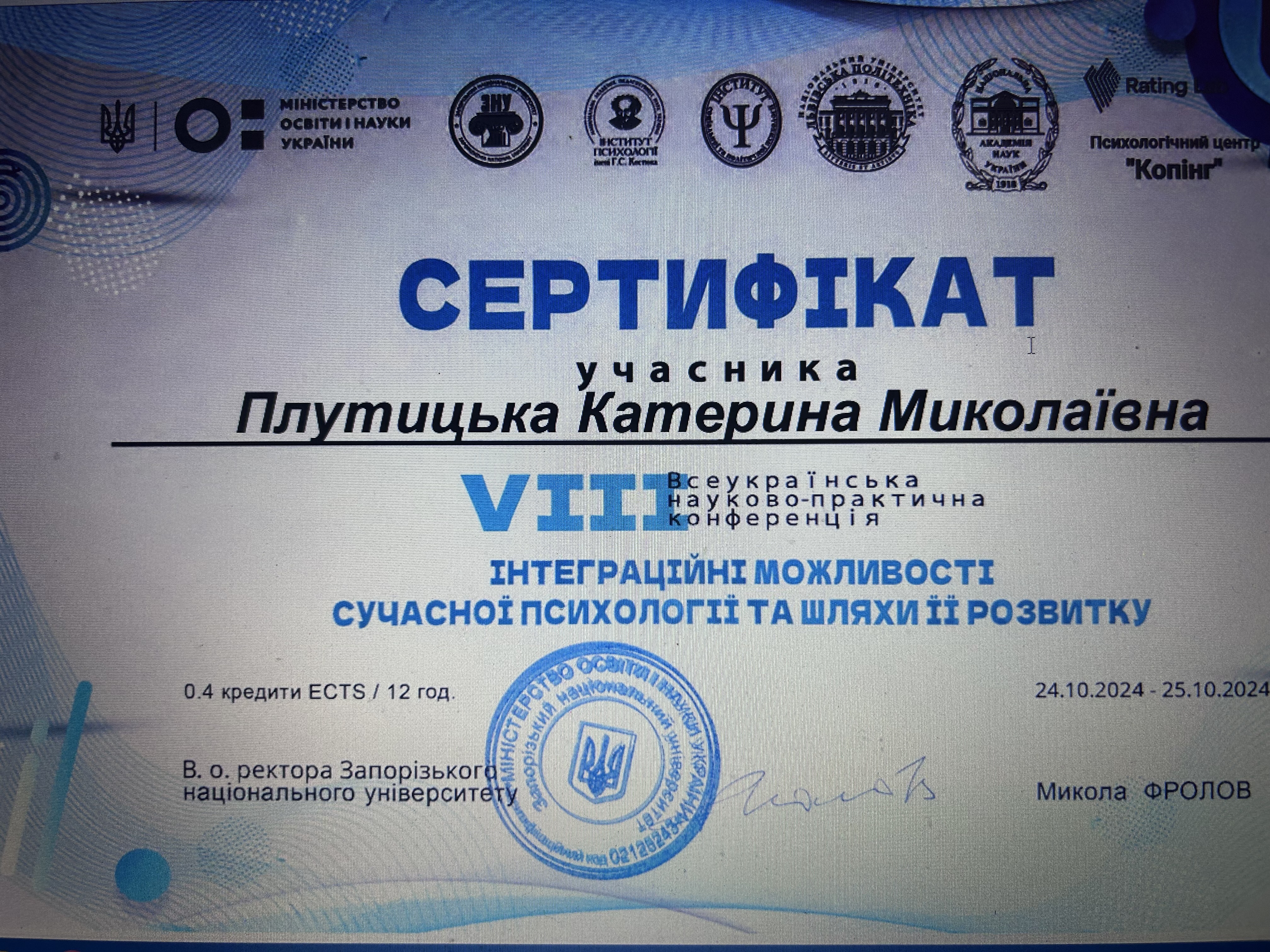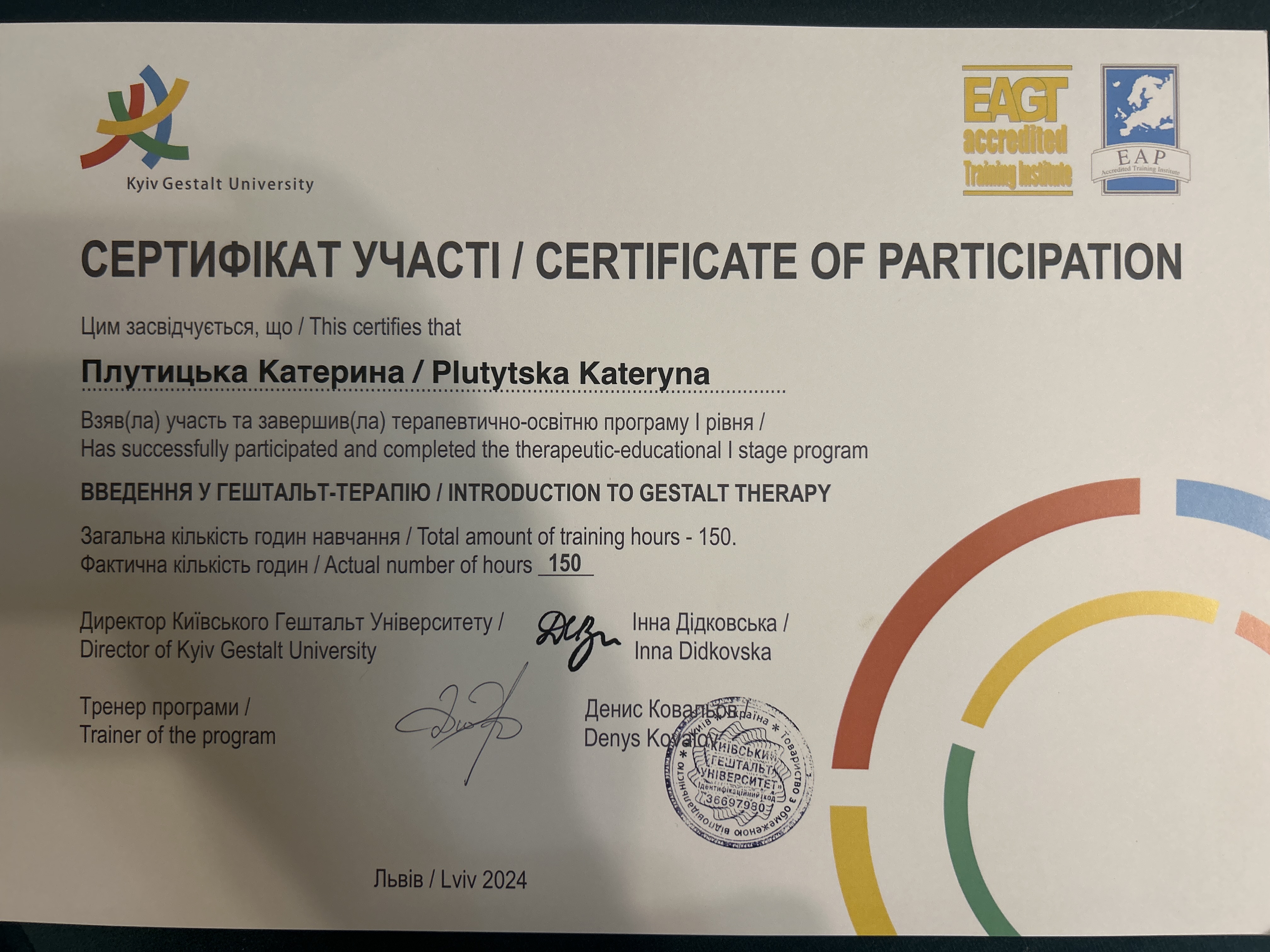 - Сертифікат Сертифікат участі Введення у гештальт-терапію з 2024 року