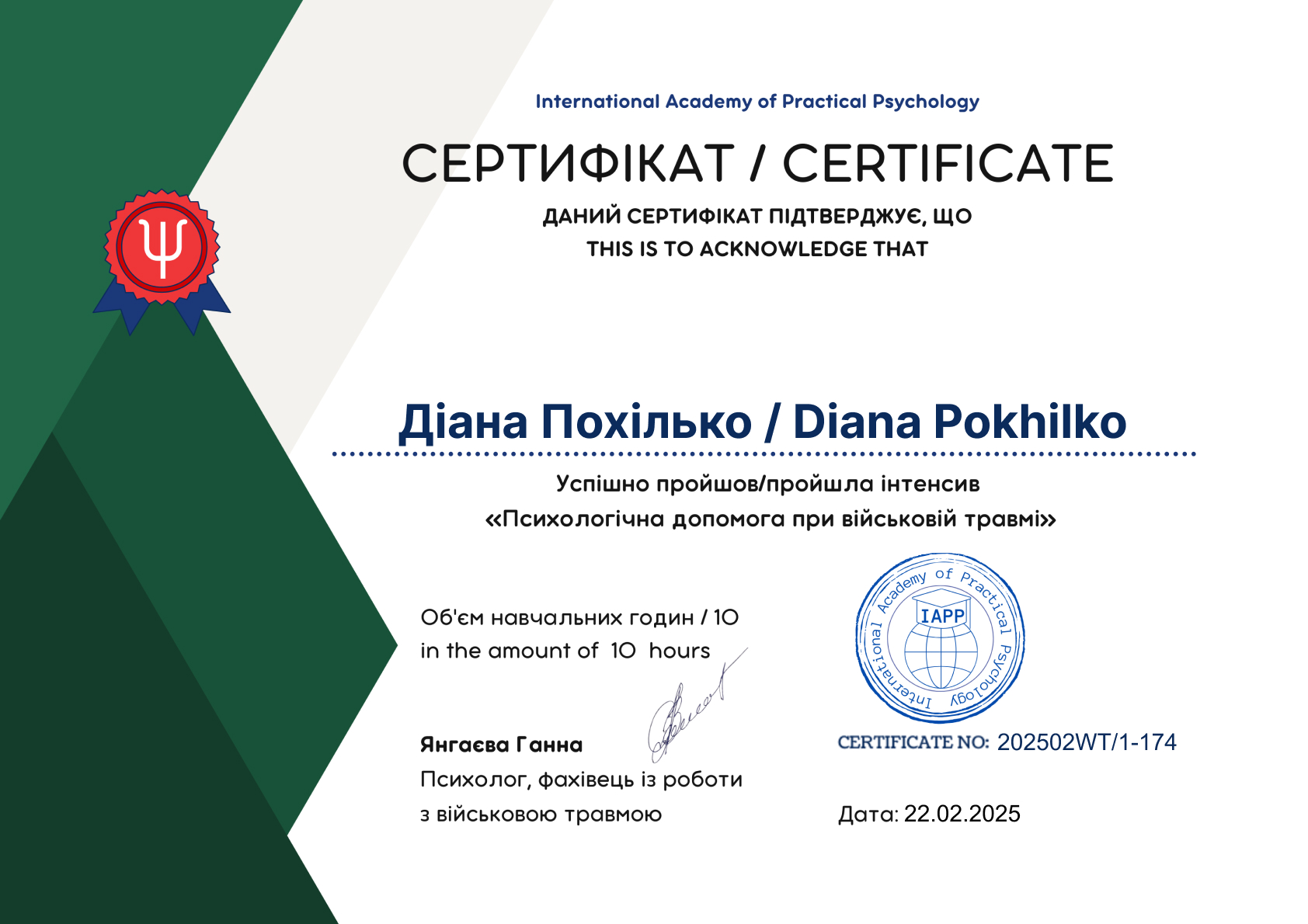 - Сертифікат Хібукітерапевт з 2022 року