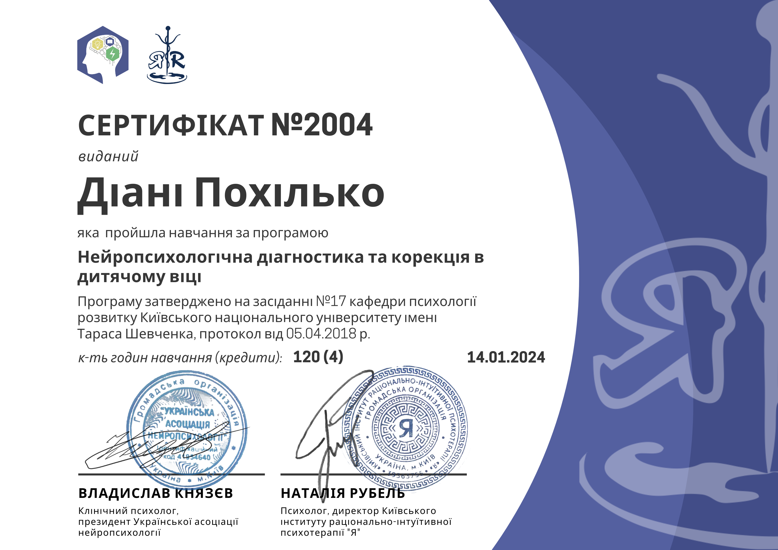 - Сертифікат Нейропсихологія діагностика та корекція в дитячому віці з 2024 року