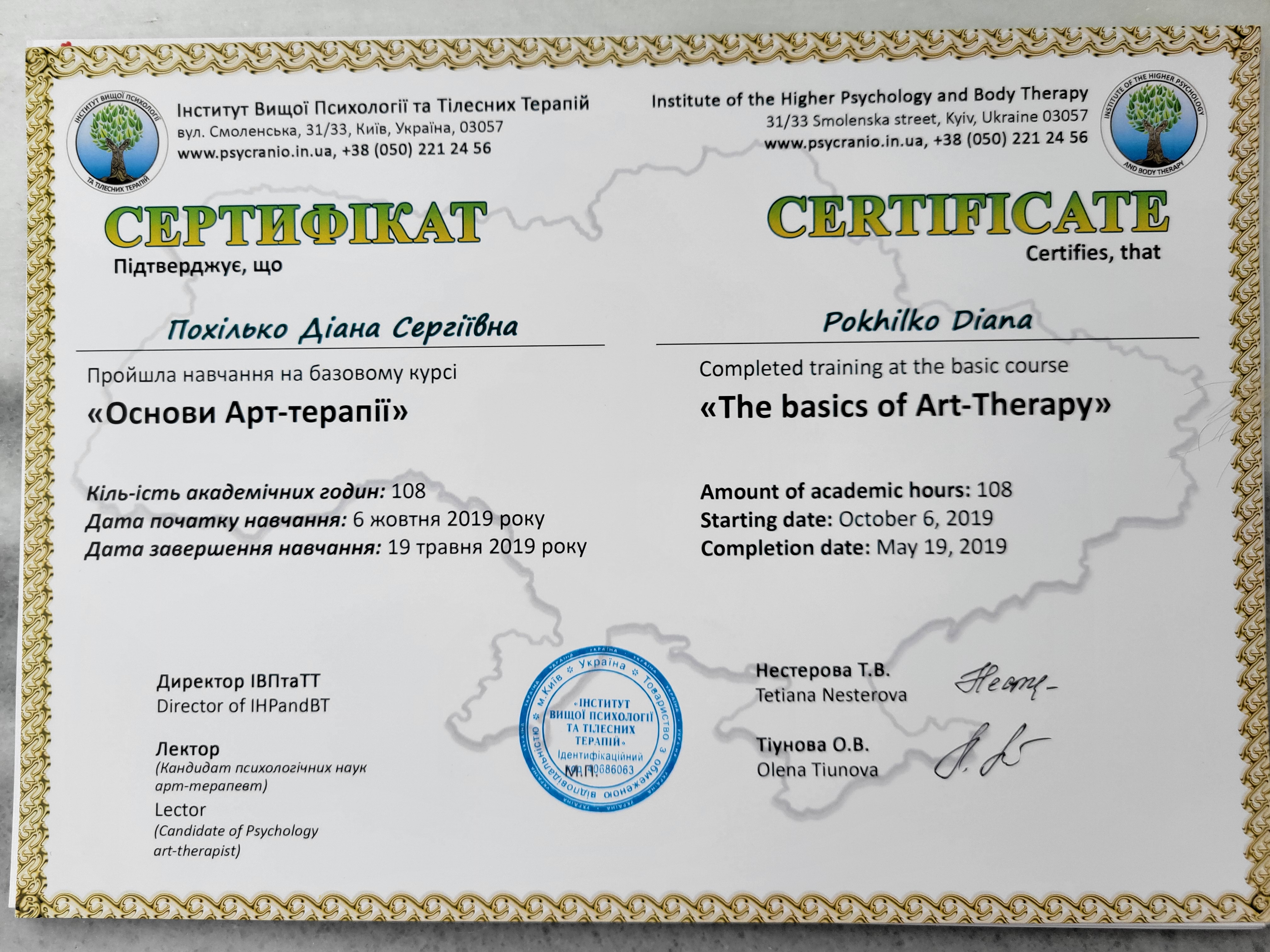 - Сертифікат Атр-терапевт з 2019 року