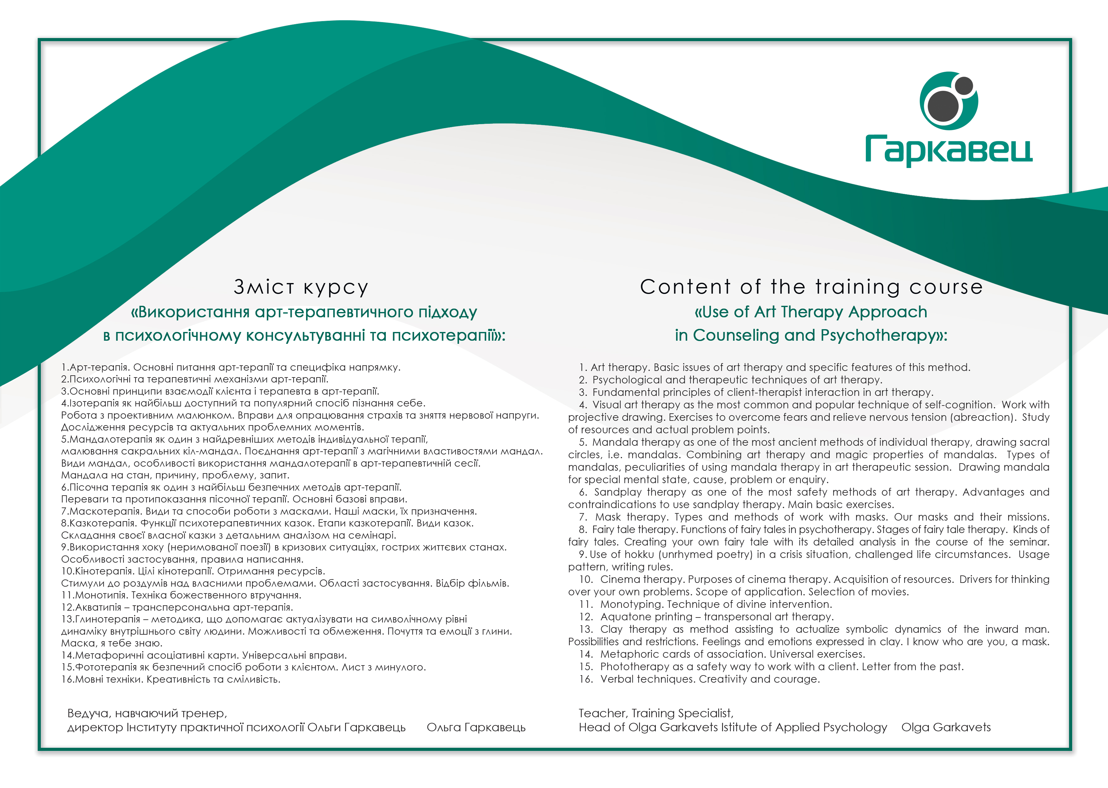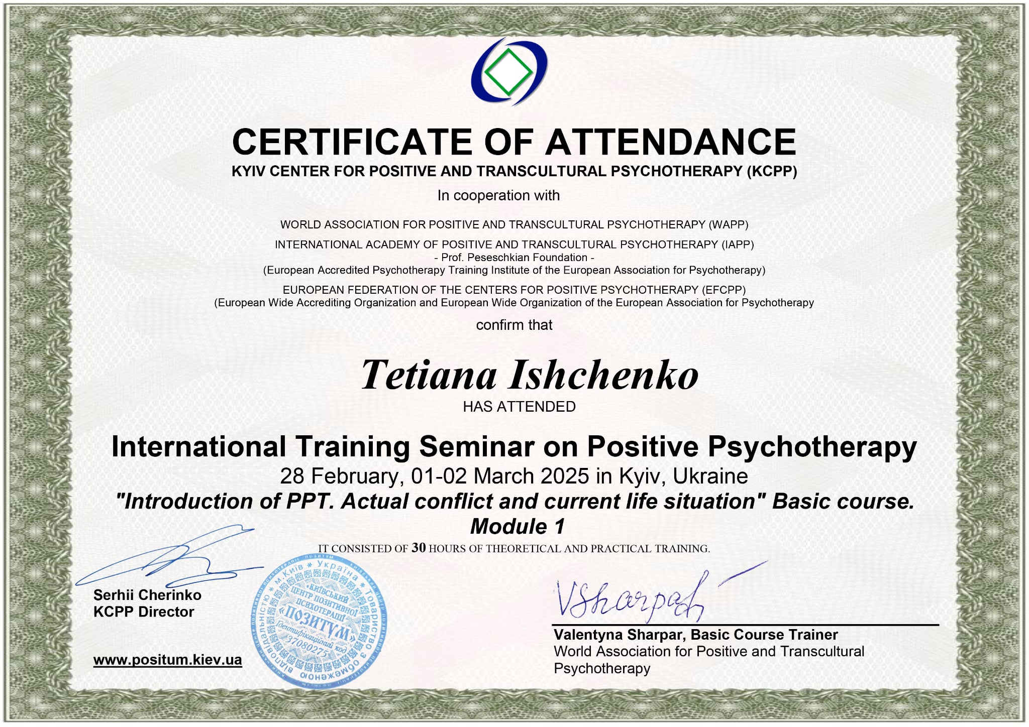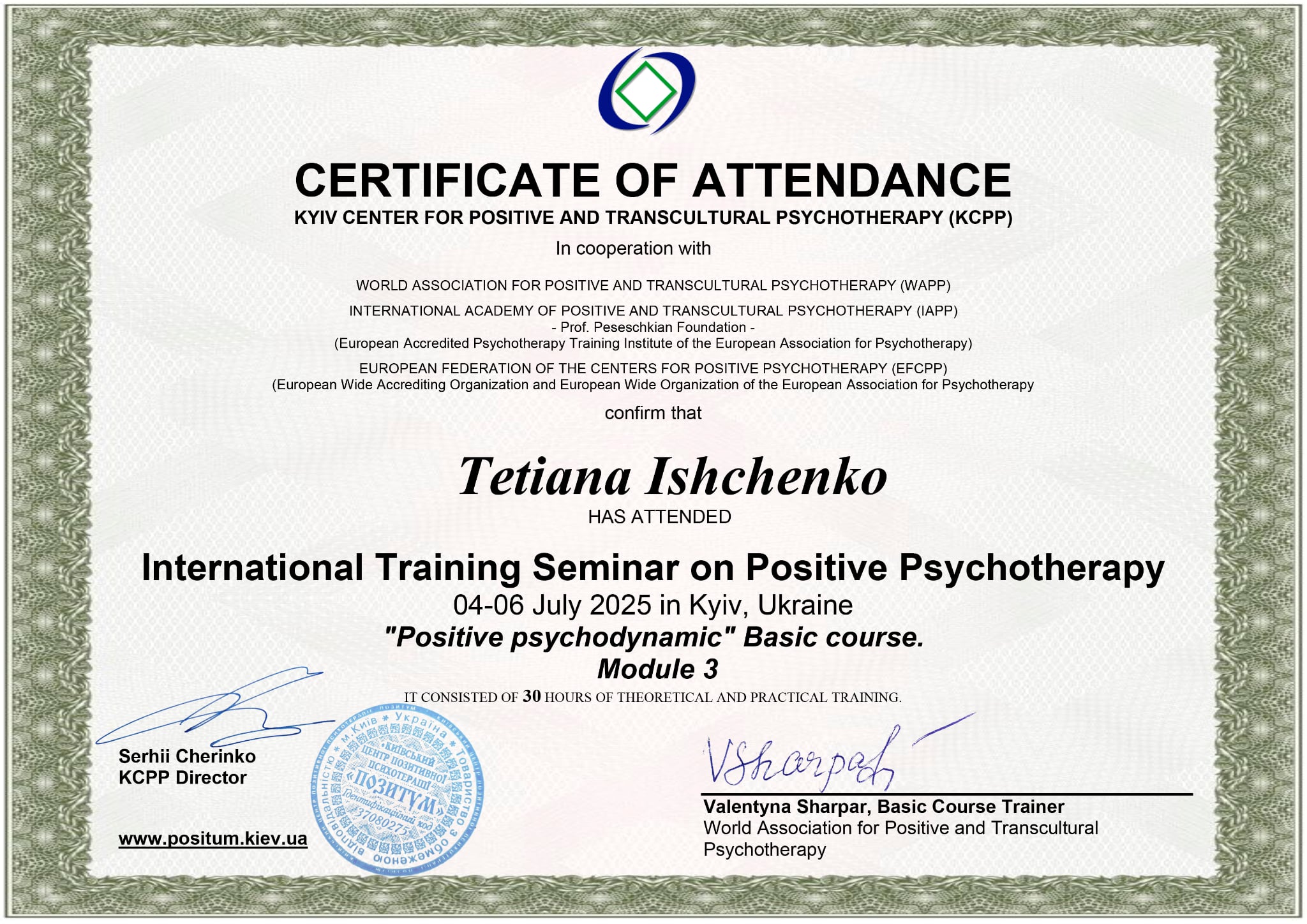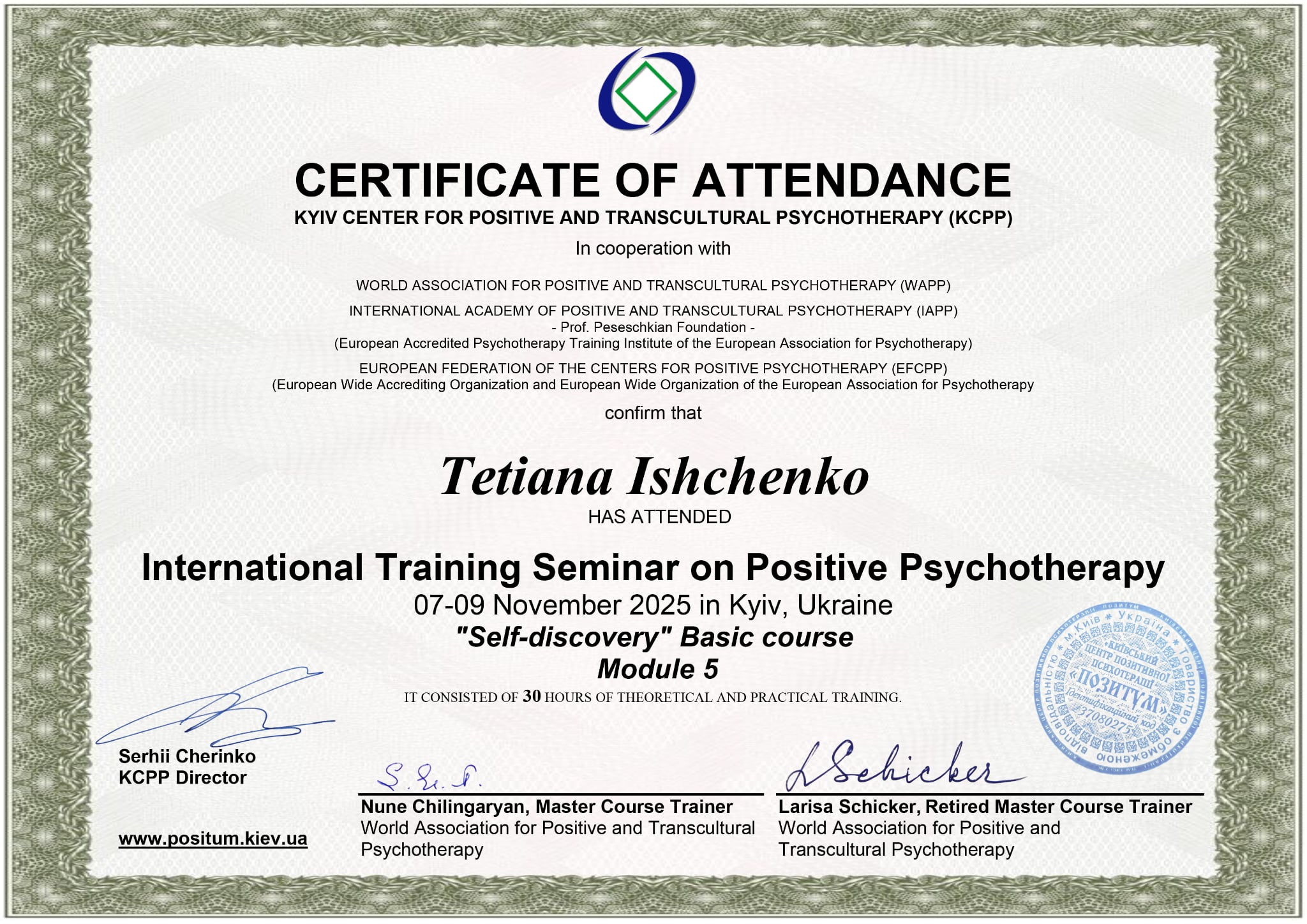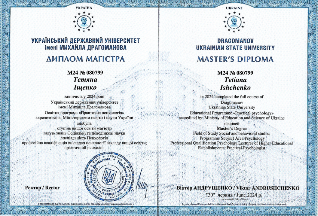 - Сертифікат Практико-орієнтований курс "Використання арт-терапевтичного підходу в психологічному консультуванні та психотерапії" з 2025 року