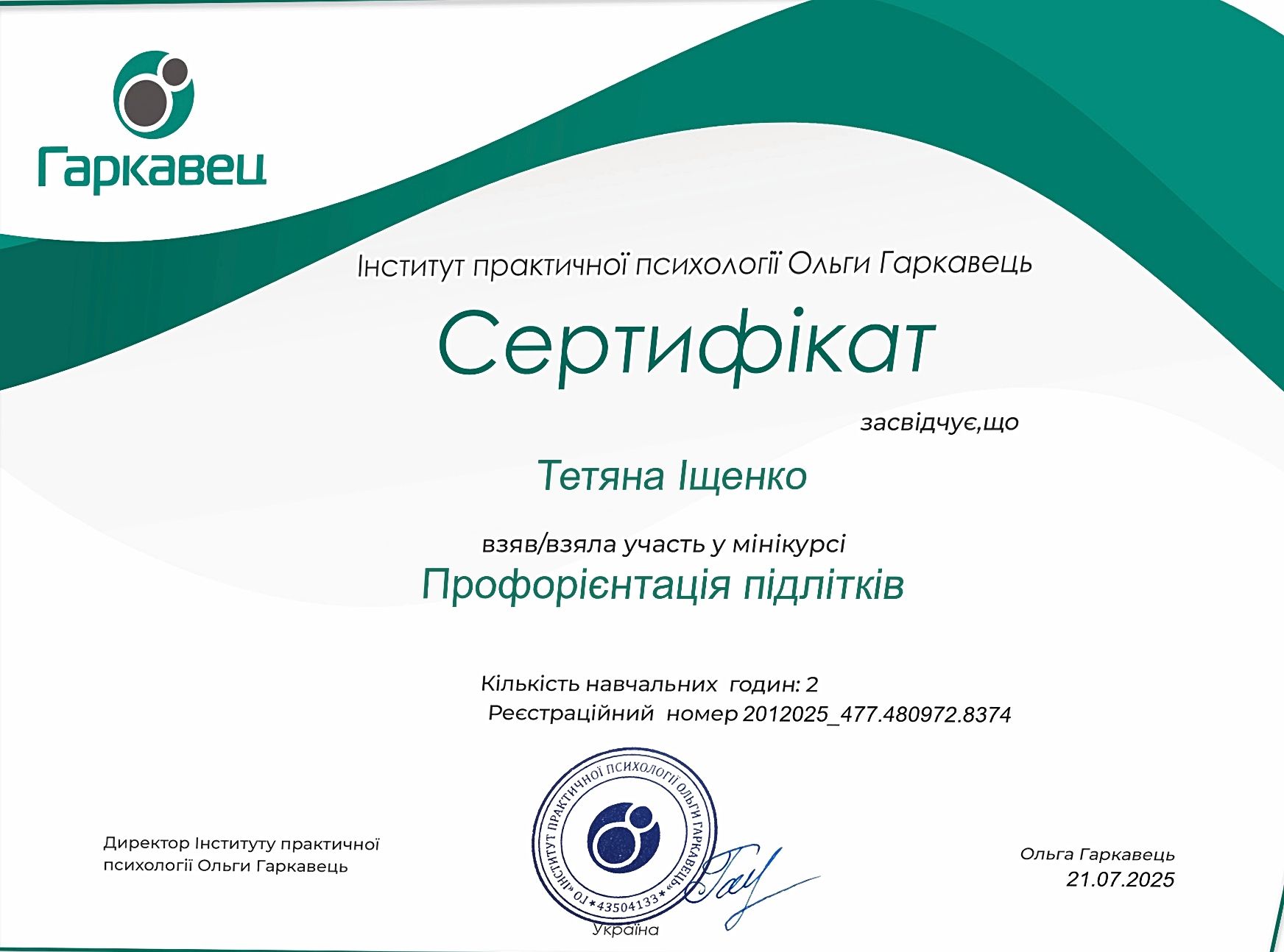 - Сертифікат Міні-курс "Профорієнтації підлітків" з 2025 року