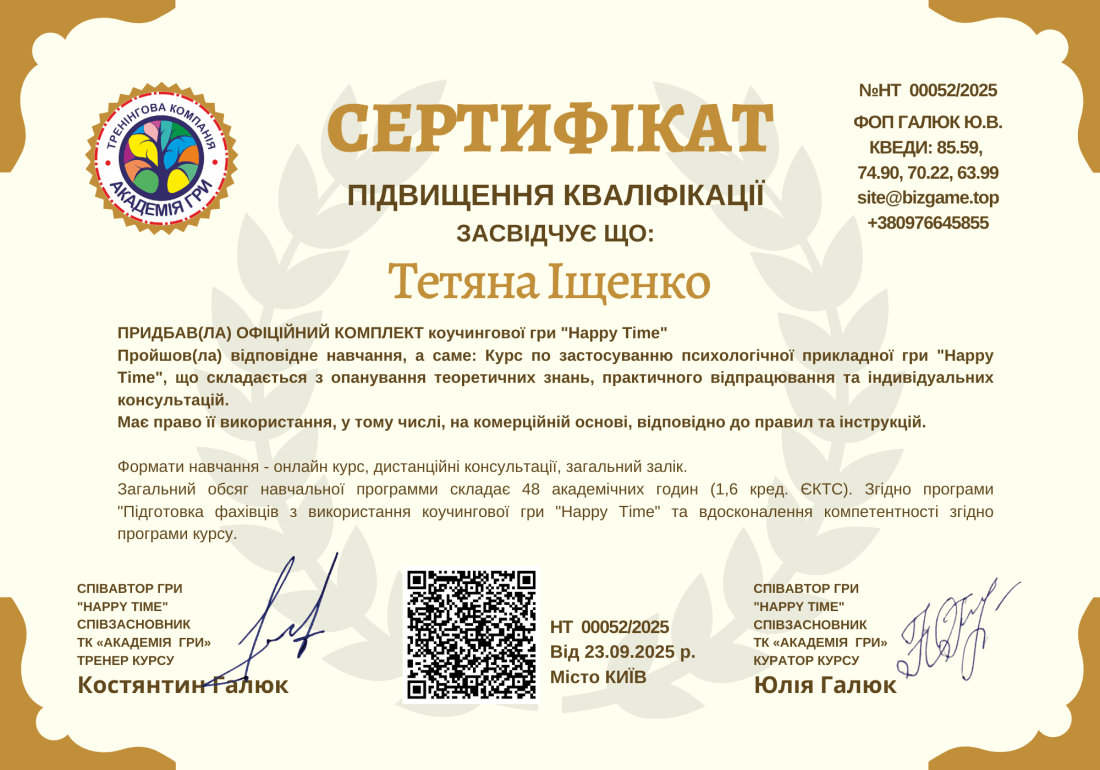 - Сертифікат Курс по застосуванню психологічної гри "Happy Time" з 2025 року