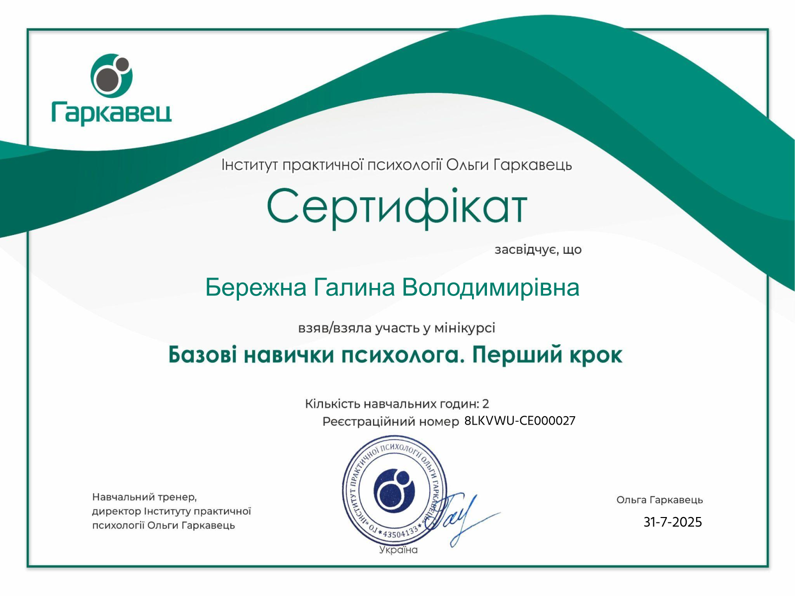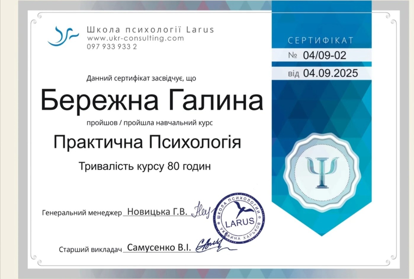 • Сертифікат Практичний психолог з 2025 року