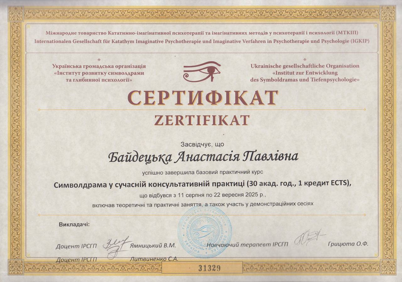 - Сертифікат Символдрама у сучасній консультативній практиці з 2025 року
