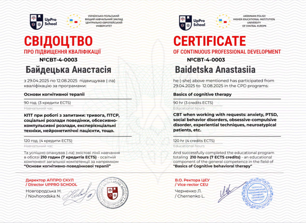 - Сертифікат КПТ- консультант з 2025 року