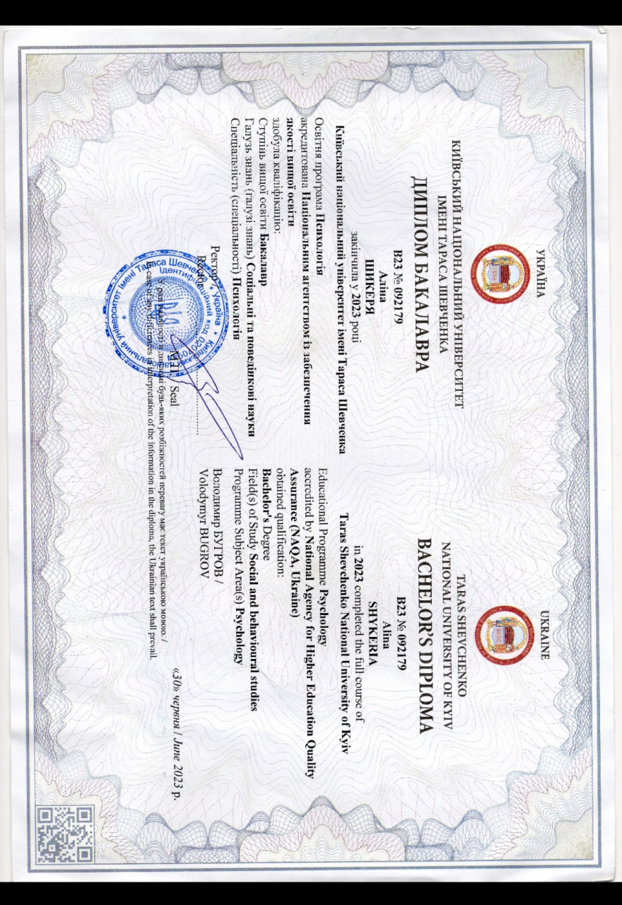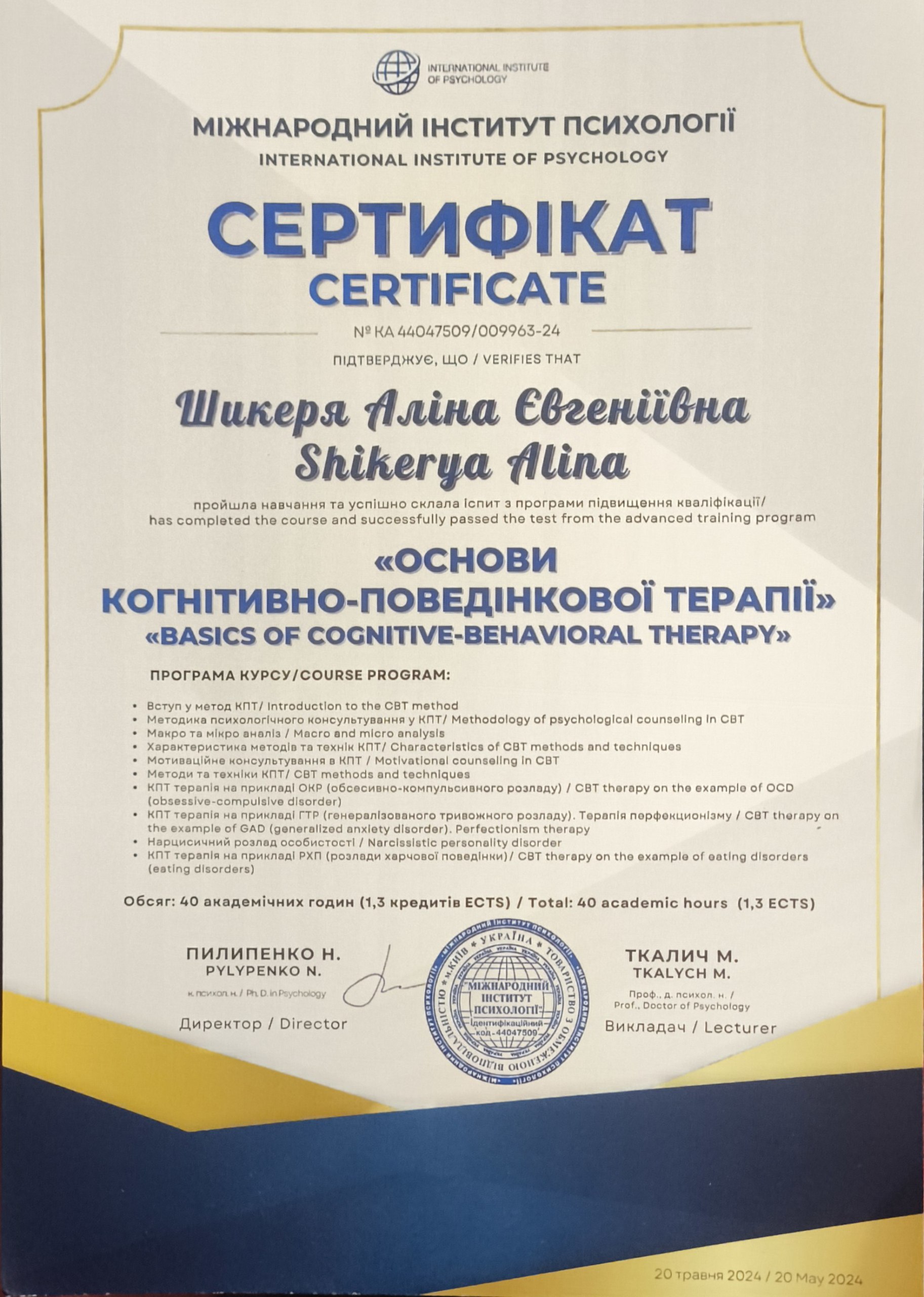 - Сертифікат Основи когнітивно-поведінкової терапії (CBT) з 2024 року