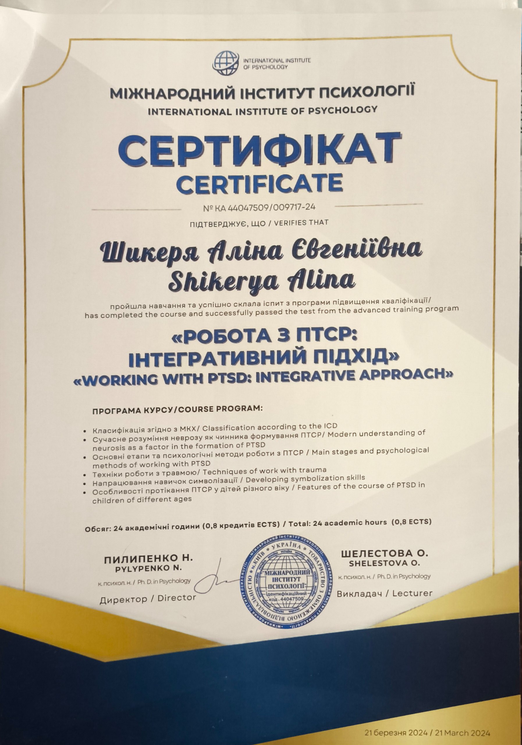 - Сертифікат Робота з ПТСР: Інтегративний підхід (Working with PTSD: Integrative Approach) з 2024 року