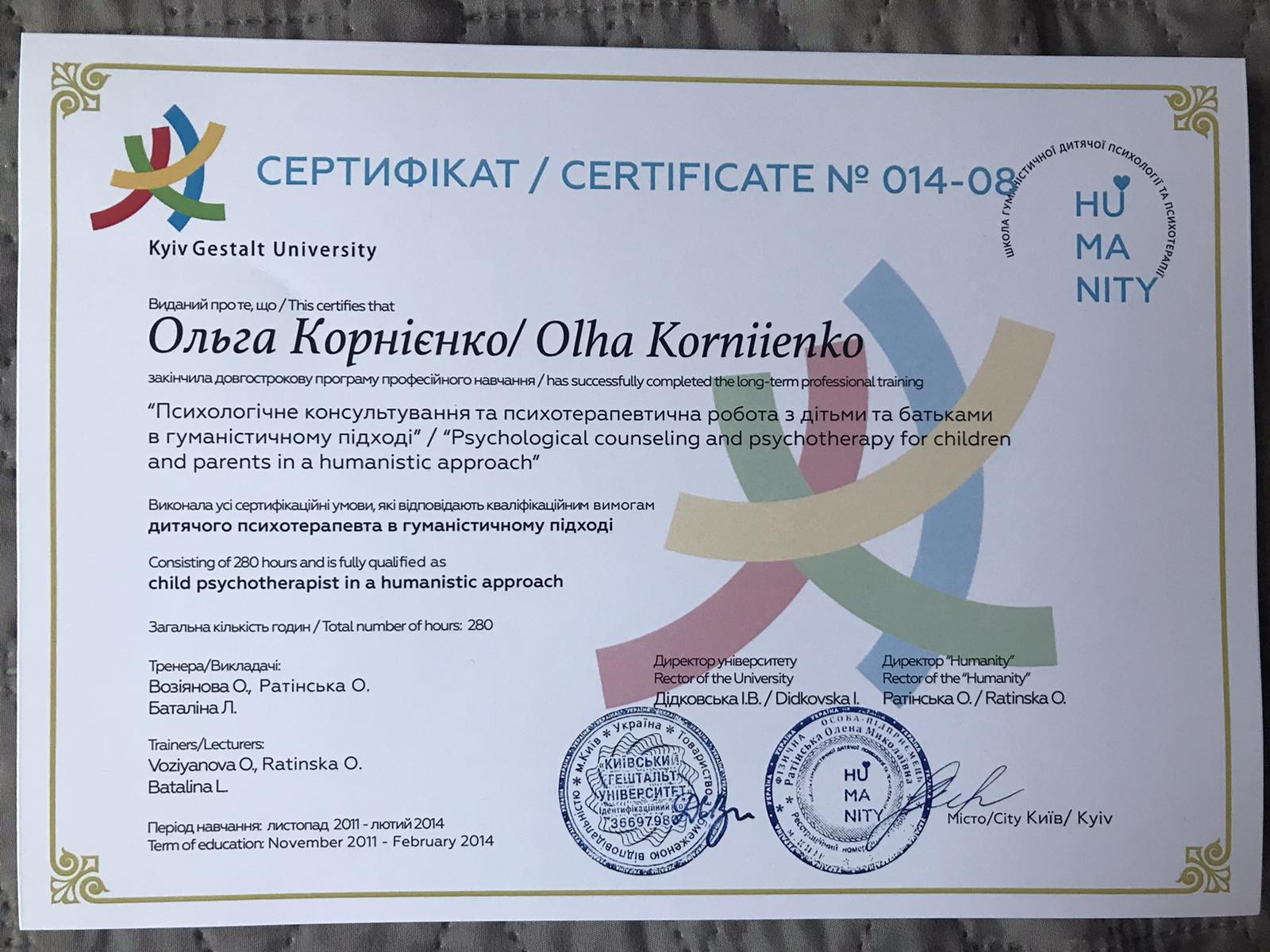 - Сертифікат Дитячий психотерапевт в гуманістичному підході з 2014 року