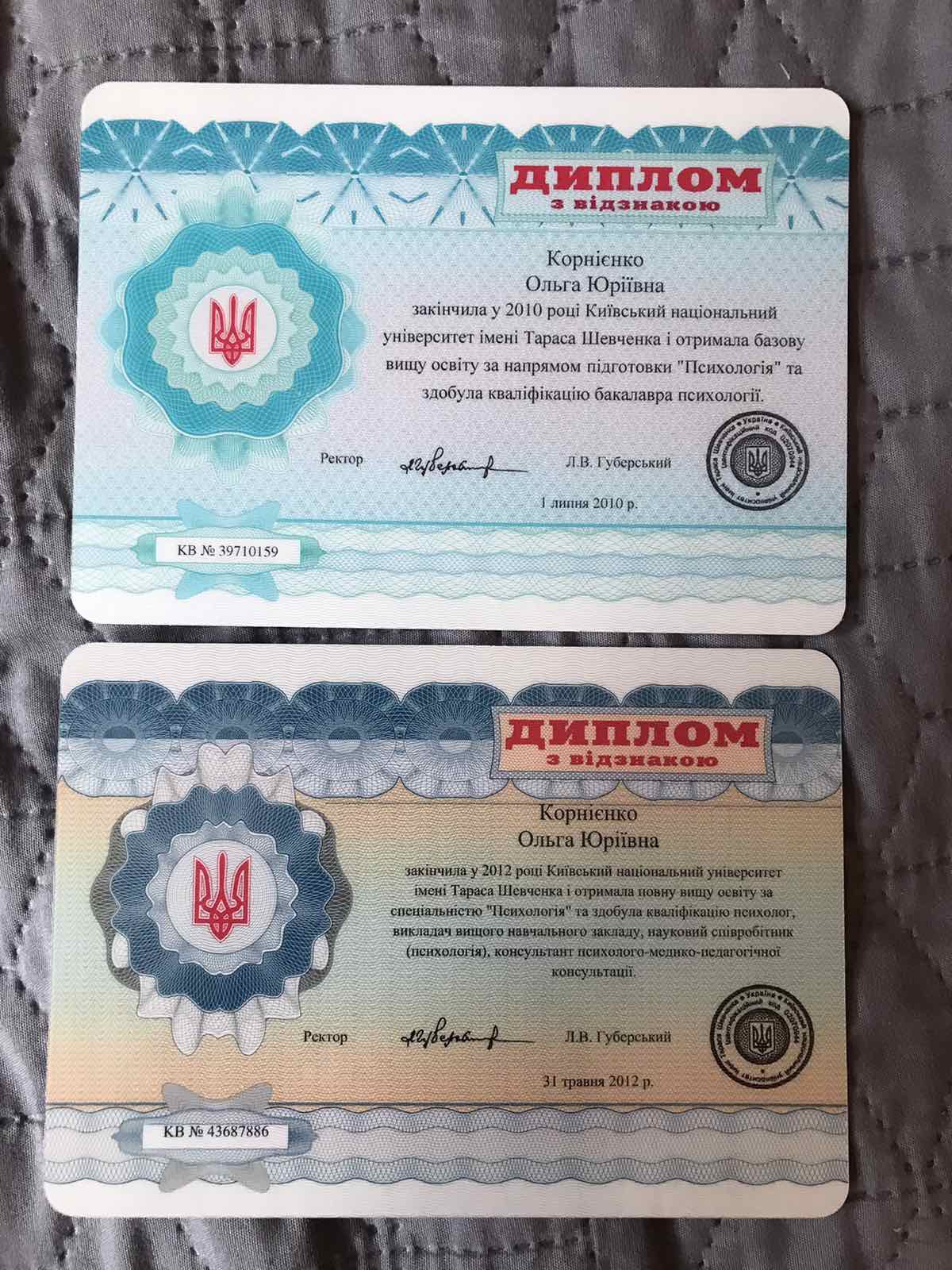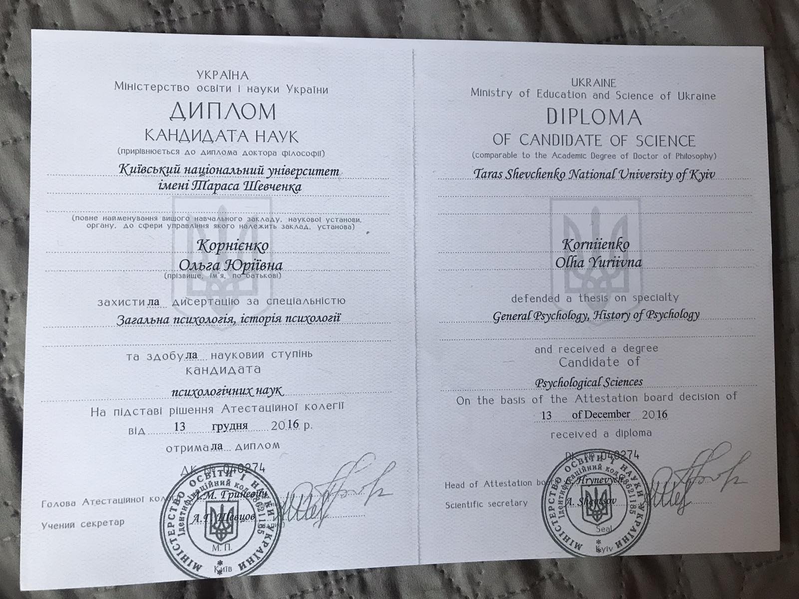 - Сертифікат Диплом кандидата наук в галузі психології з 2016 року