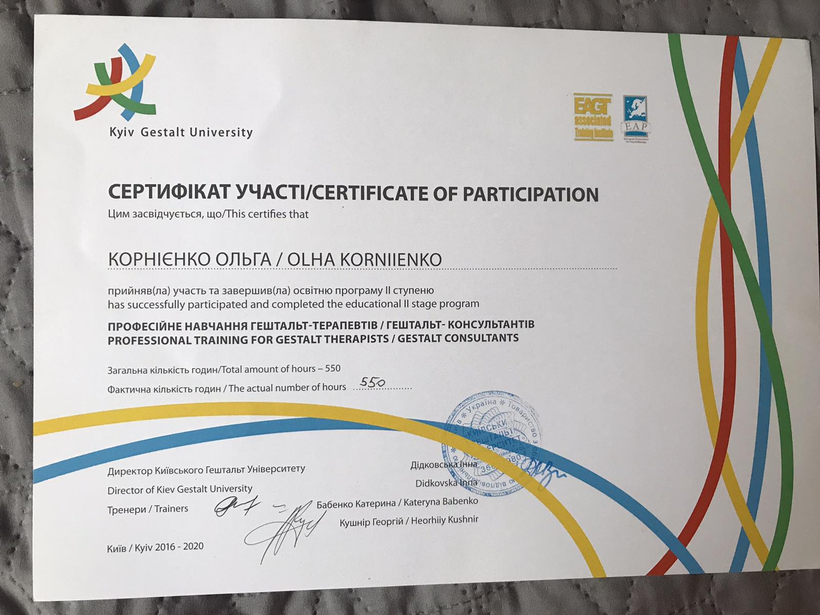 Вітаю. Мене звати Ольга Корнієнко, я кандидат психологічних наук, тренер, психолог-консультант для дорослих, сімей та дітей,, гештальт-терапевт на етапі підготовки до сертифікації.