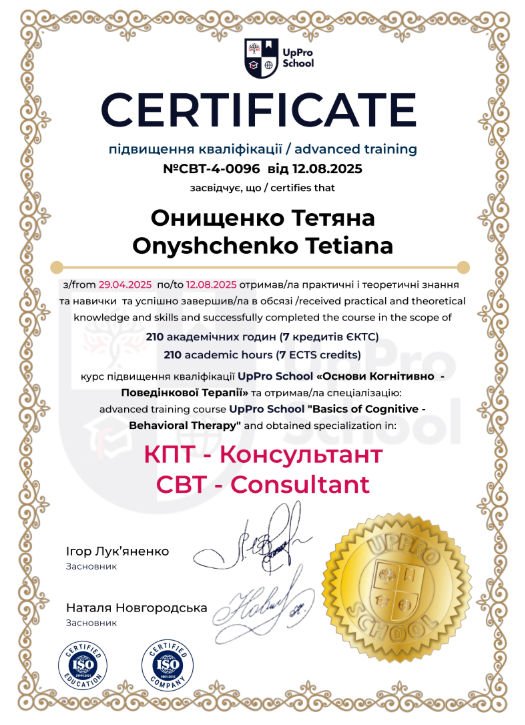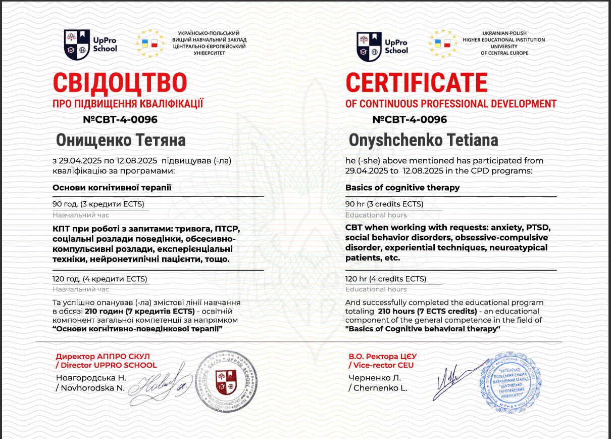 - Сертифікат курс підвищення кваліфікації "Основи Когнітивно-поведінкової терапії. з 2025 року