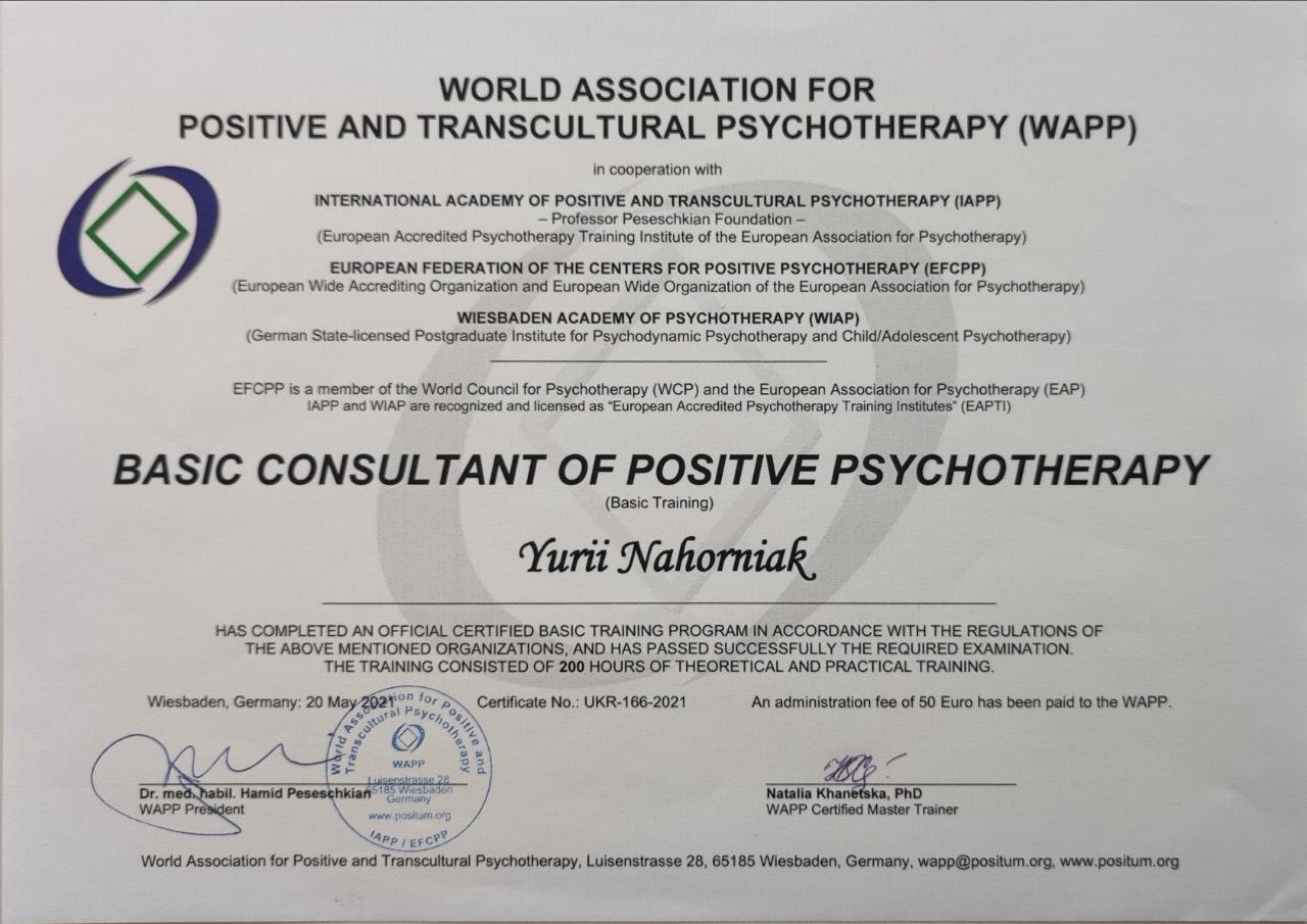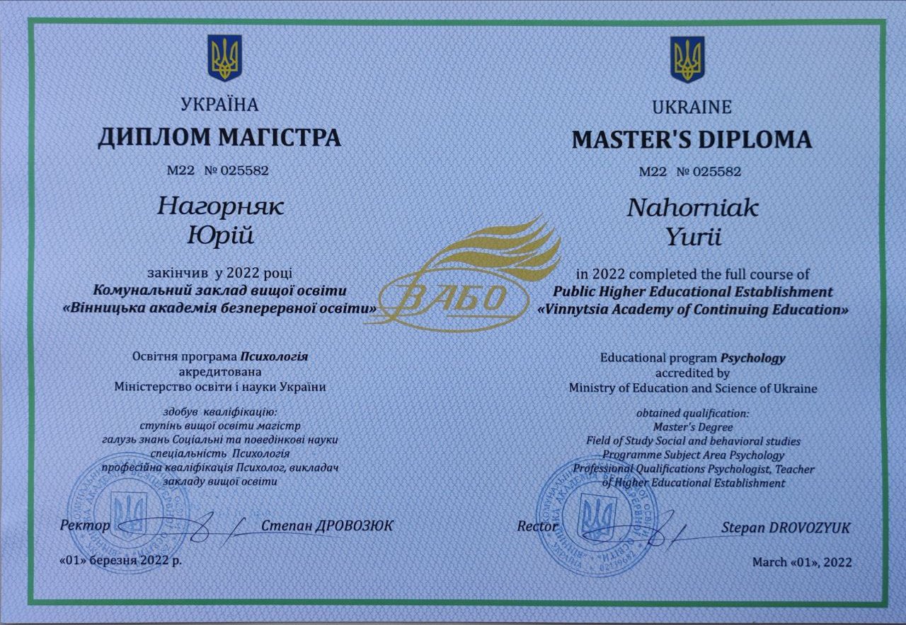 Вітаю, я Юрій Нагорняк – ваш психолог, психотерапевт, сексолог, кризовий психолог, гіпнолог, парний терапевт, а разом з тим, магістр психології та здобувач ступеня доктора філософії з психології (PhD).