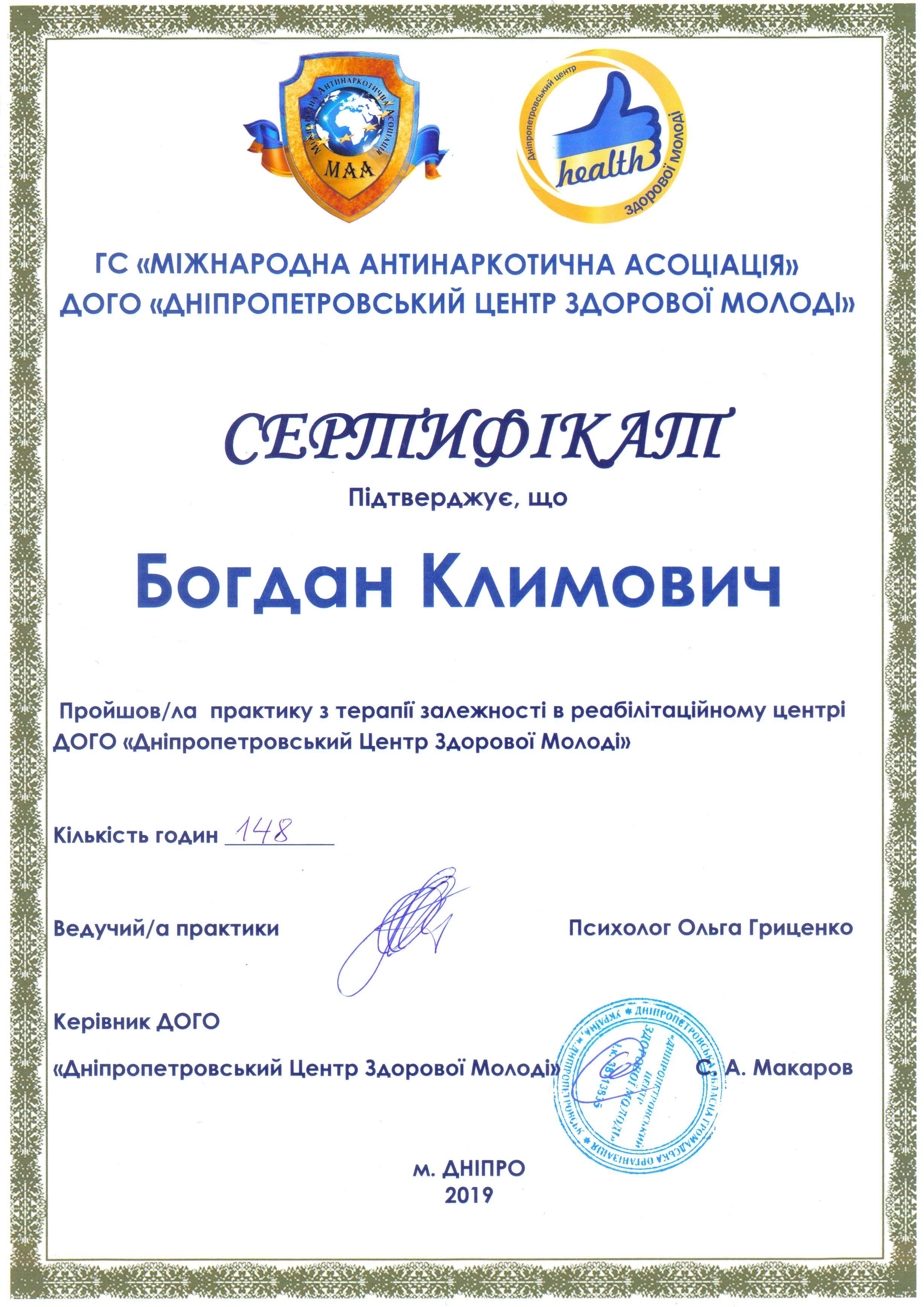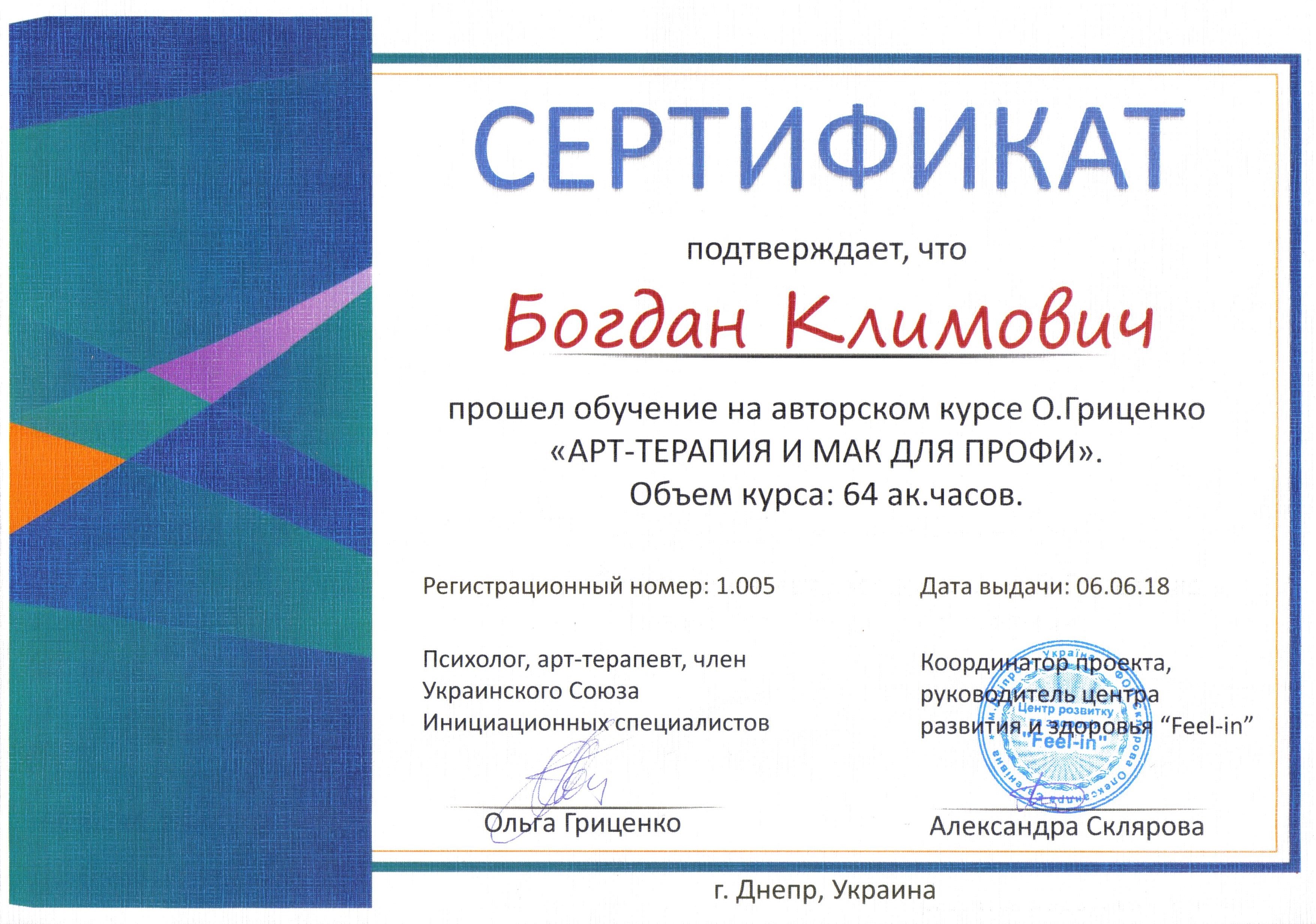 - Сертифікат Арт-терапія и МАК для профі. Навчальний проект з 2018 року