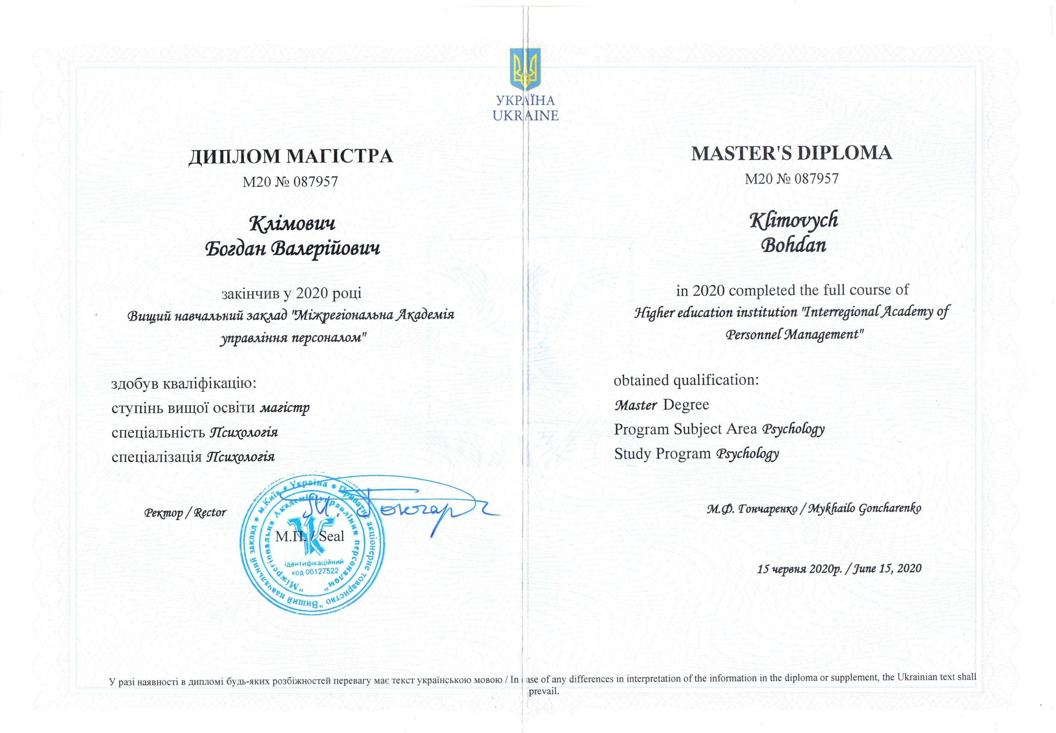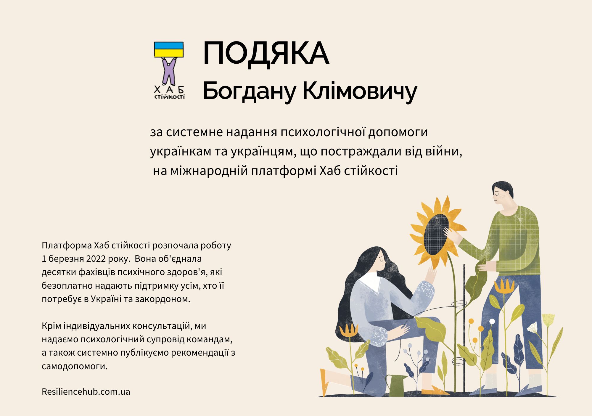 Вітаю, мене звати Богдан Клімович, я магістр психології. Працюю в методі трансакційного аналізу (ТА), а також застосовую ефективні психотерапевтичні підходи, такі як когнітивно-поведінкова терапія (КПТ), нейролінгвістичне програмування (НЛП), арт-терапія та інші доказові методики.