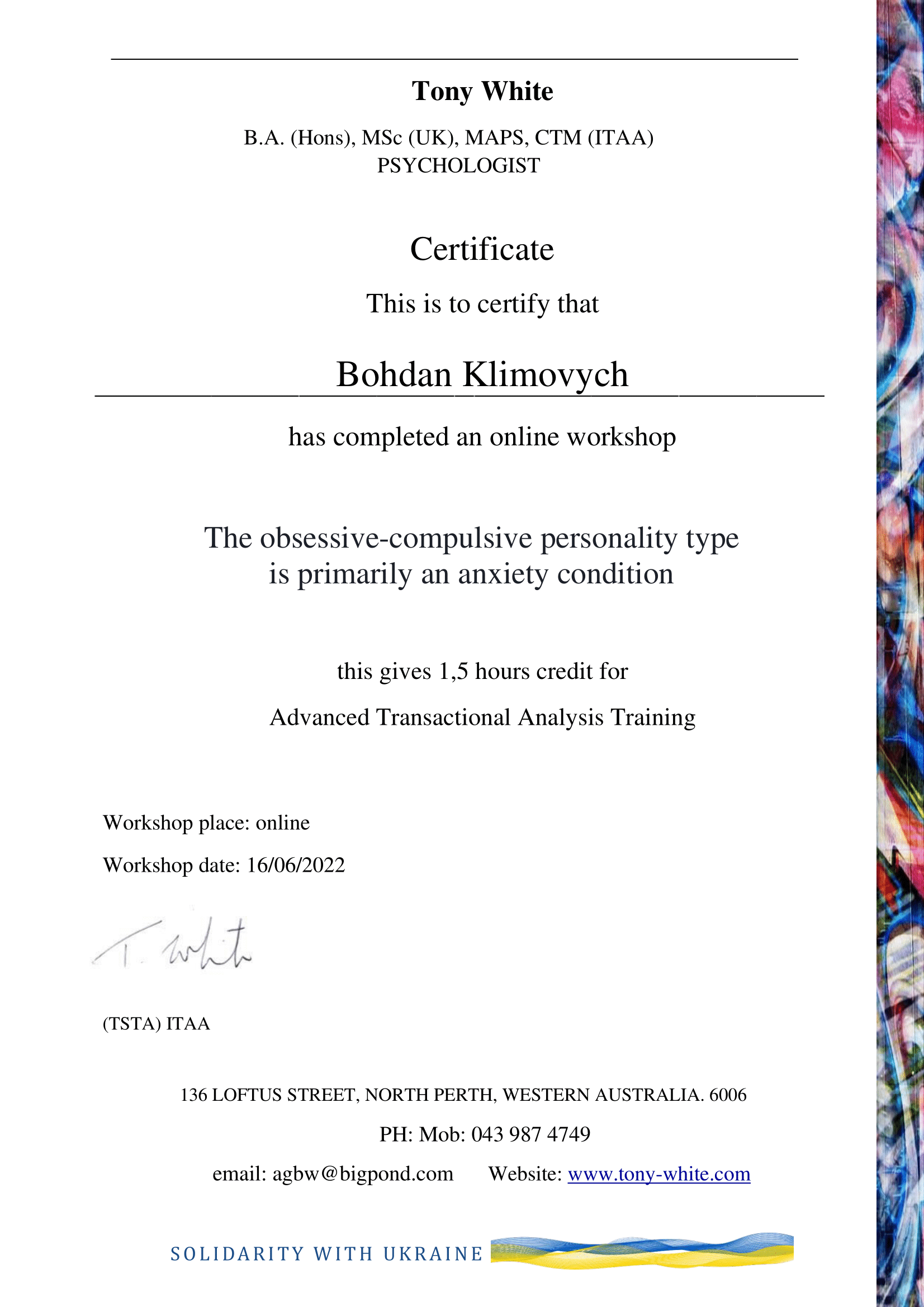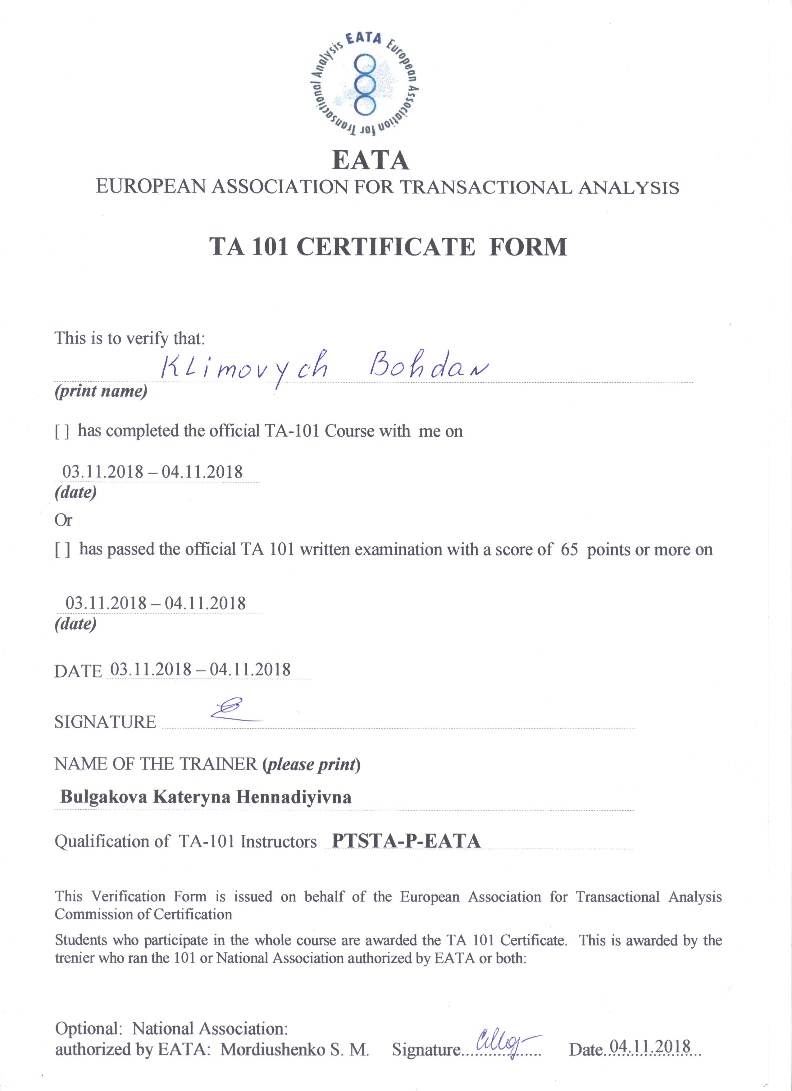 - Сертифікат Трансакційний аналіз, курс 101 з 2018 року