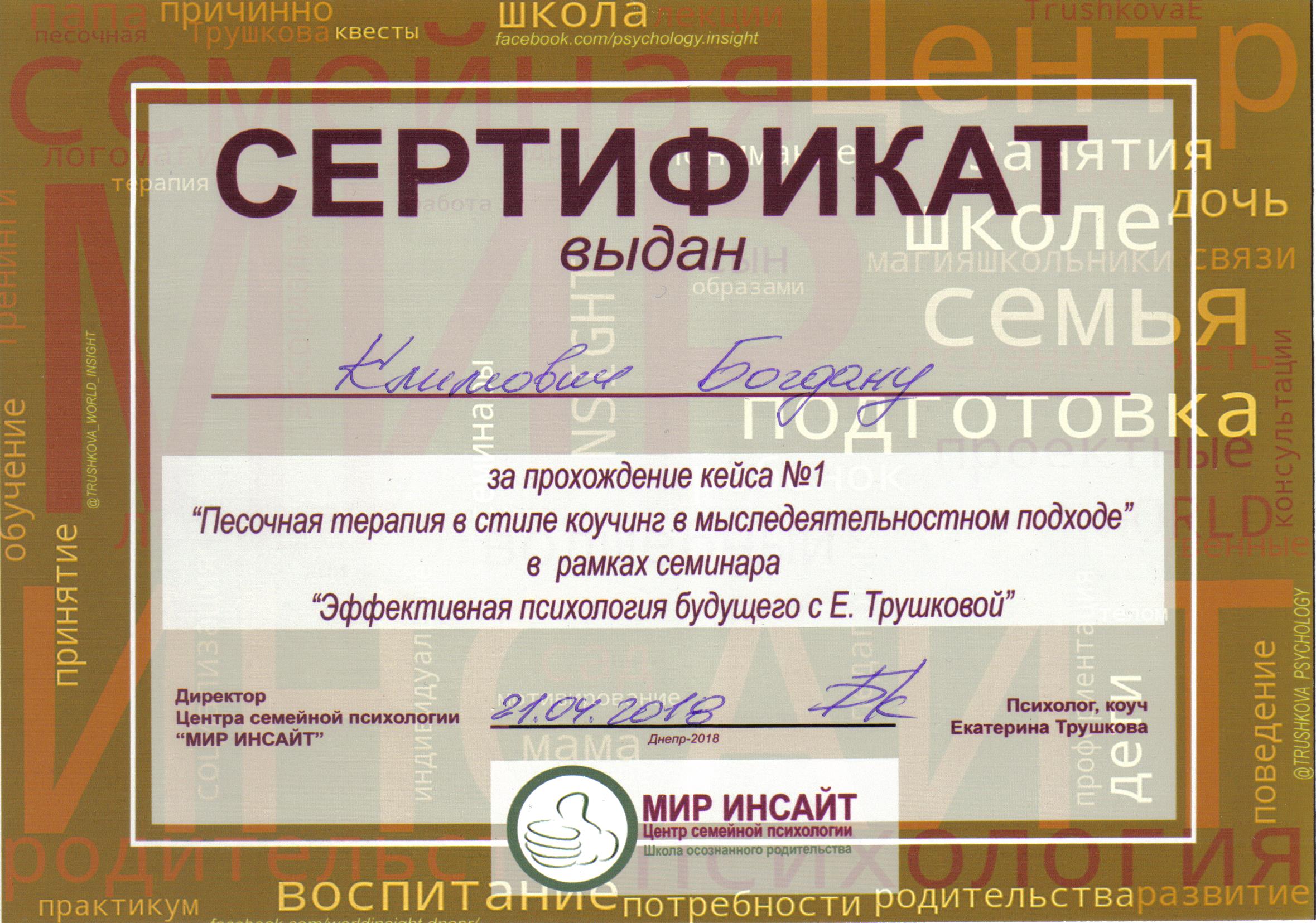- Сертифікат Пісочна терапія в стилі коучинг з 2018 року