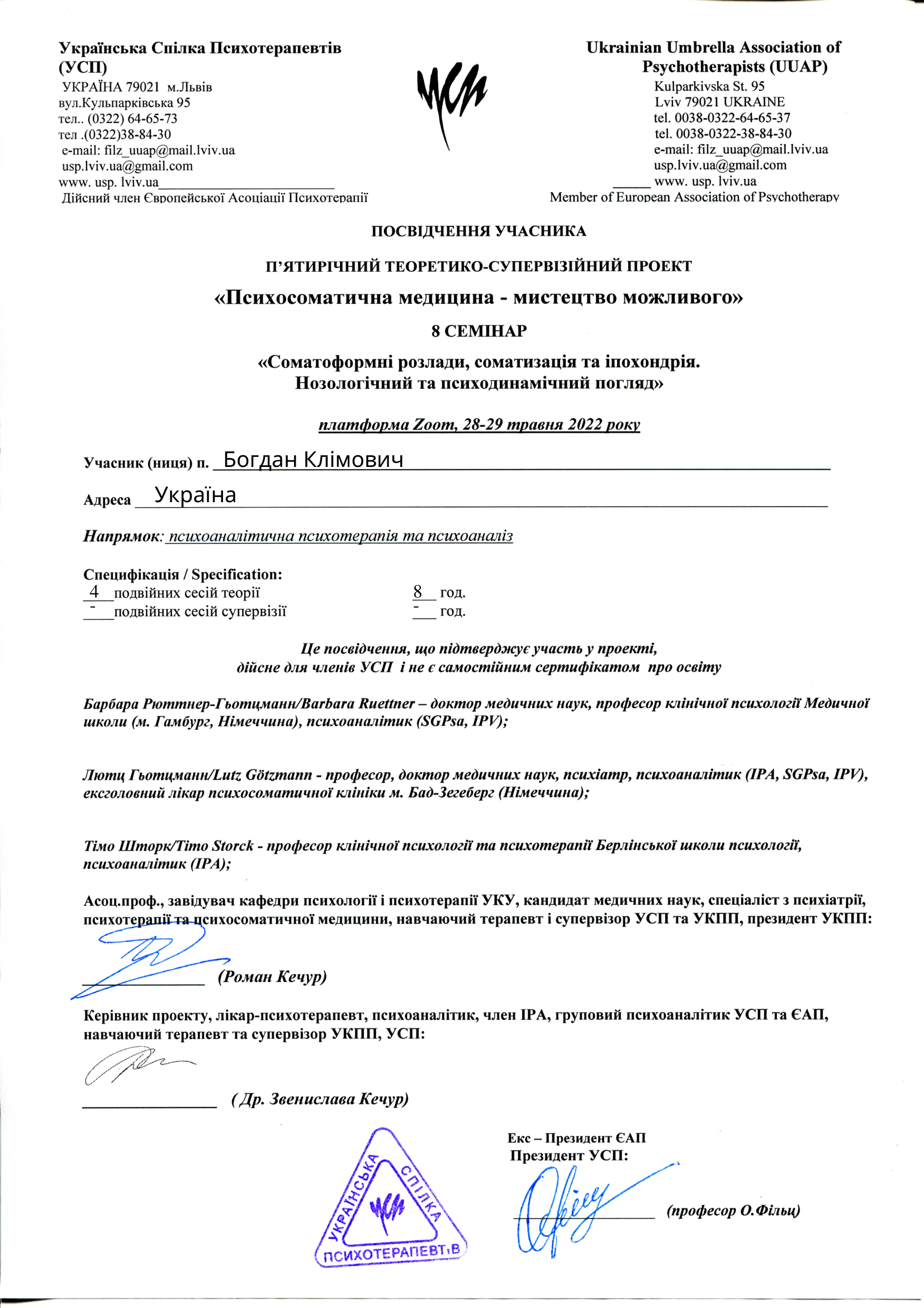 - Сертифікат Соматоформні розлади, соматизація та іпохондрія. Нозологічний та психодинамічний погляд з 2022 року