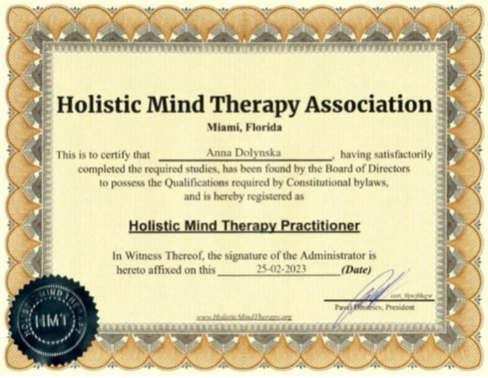 - Сертифікат Holistic Mind Therapy Practitioner з 2023 року