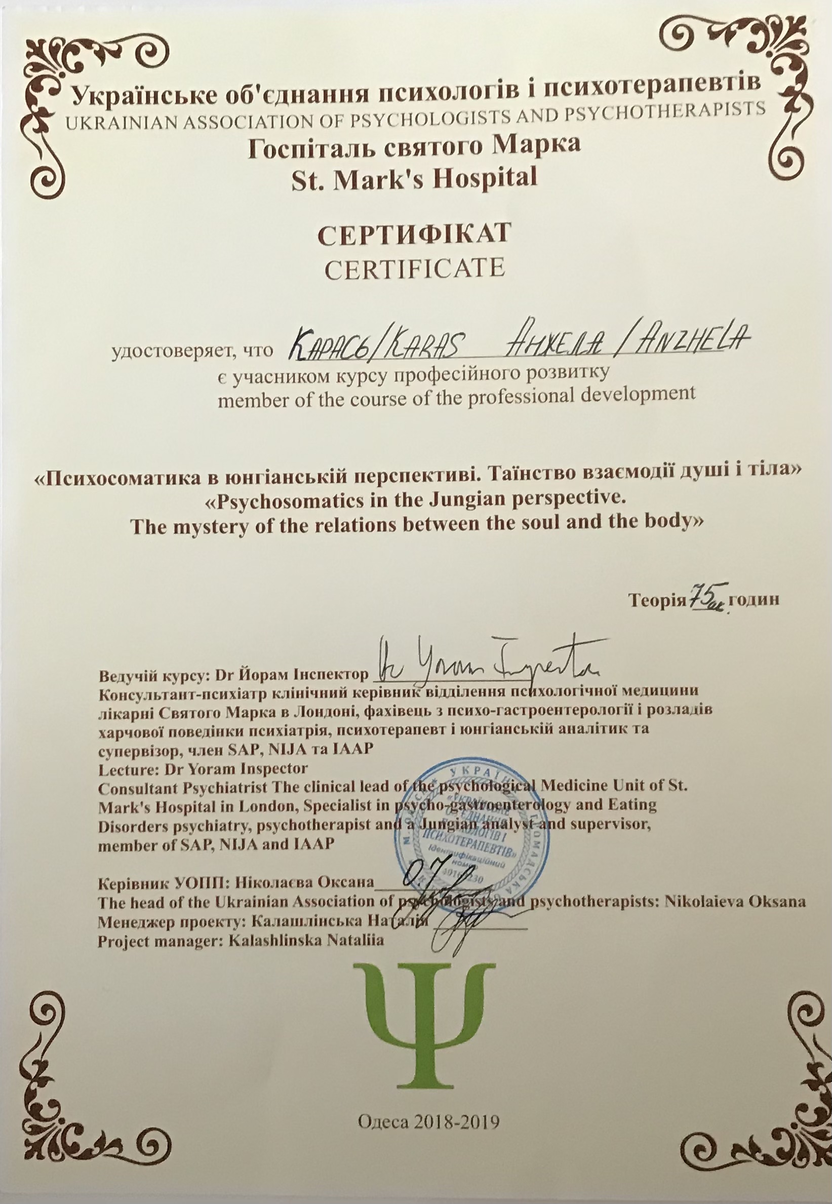 - Сертифікат Госпіталь "Св.Марка" Психосоматика в юнгіанській перспективі з 2019 року