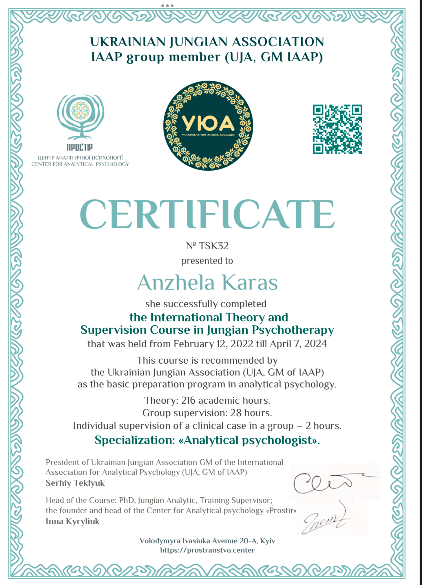 - Сертифікат Свідоцтво про закінчення курсу "Аналітична психологія і основи сучасного психоаналізу з 2024 року