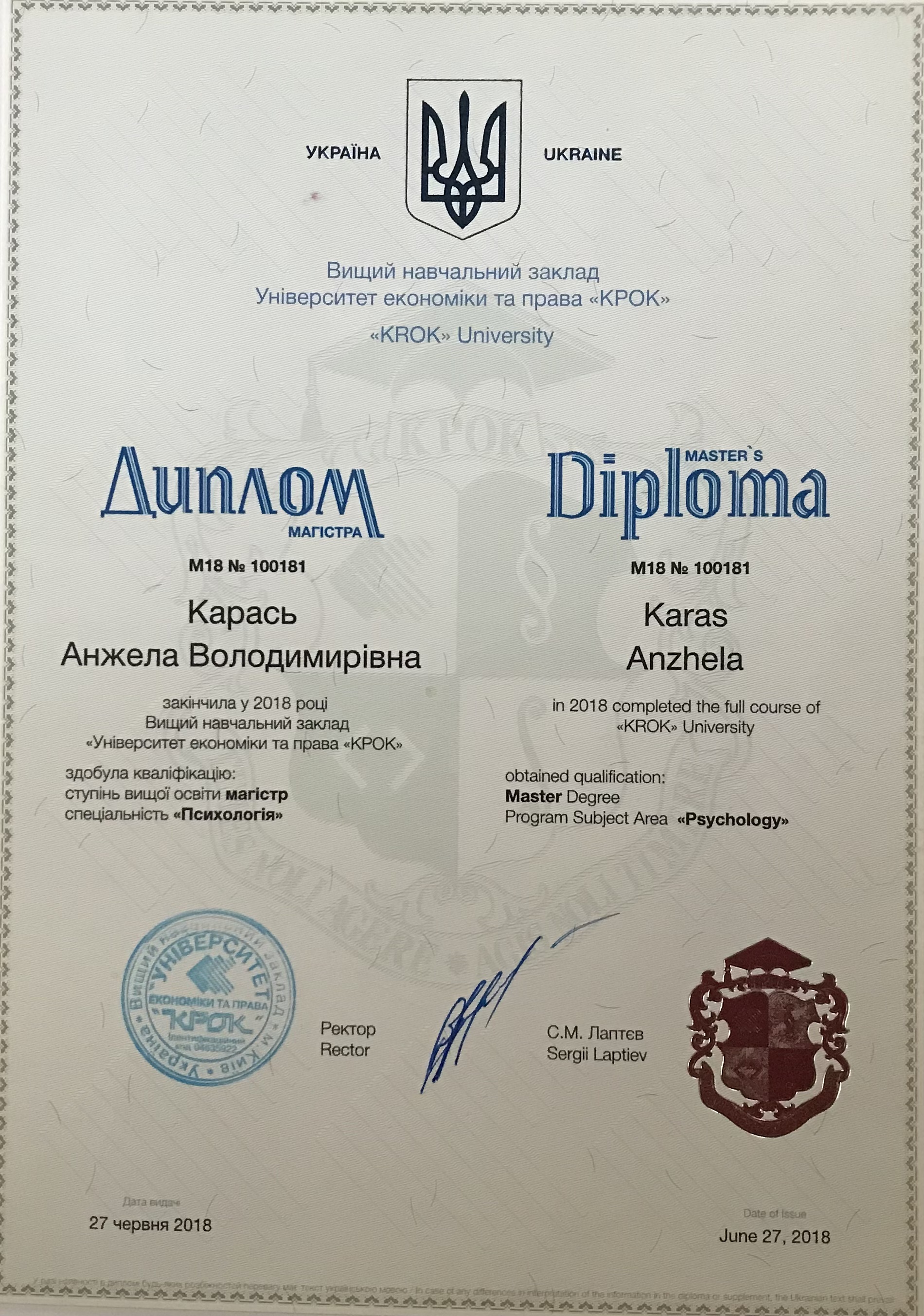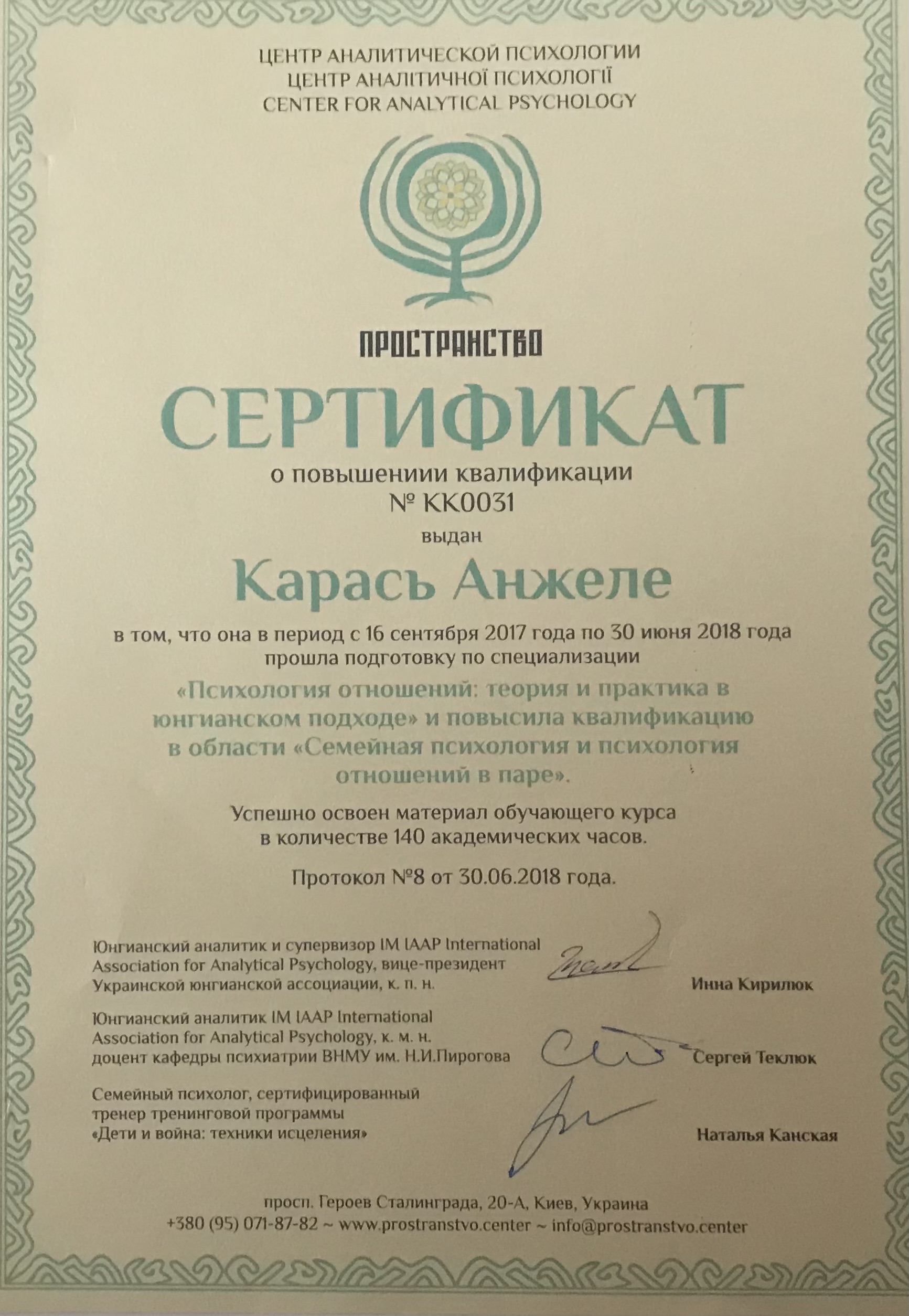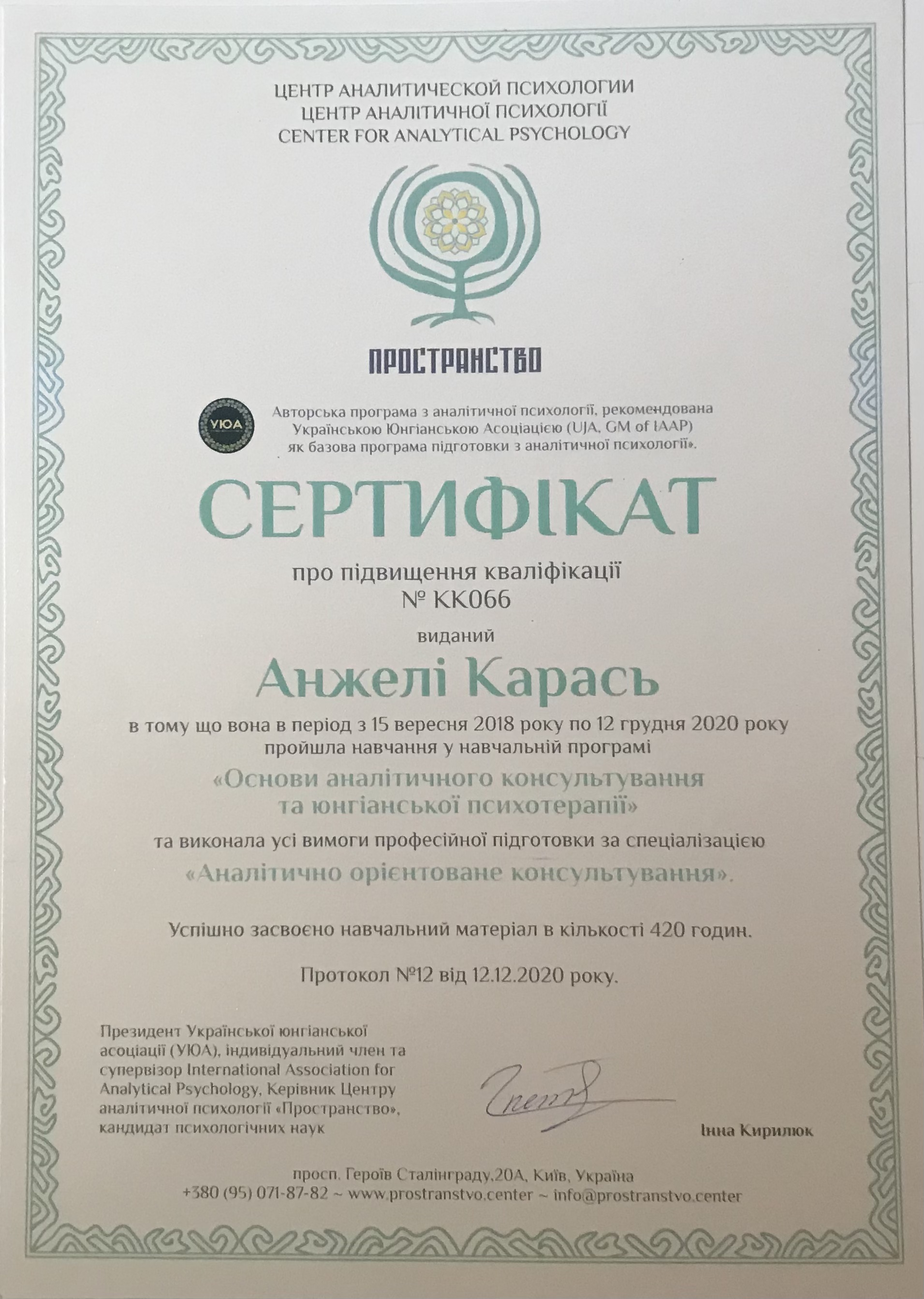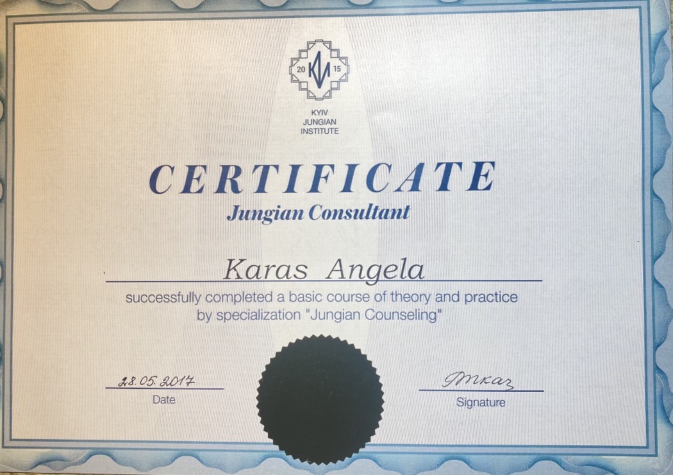 - Сертифікат КЮІ Диплом "Юнгіанський консультант" з 2017 року