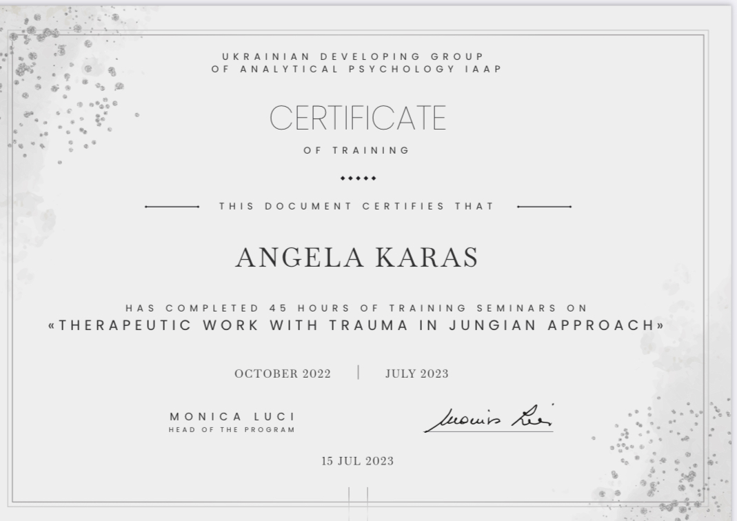 - Сертифікат УГР/ІААР«THERAPEUTIC WORK WITH TRAUMA IN JUNGIAN APPROACH» з 2023 року
