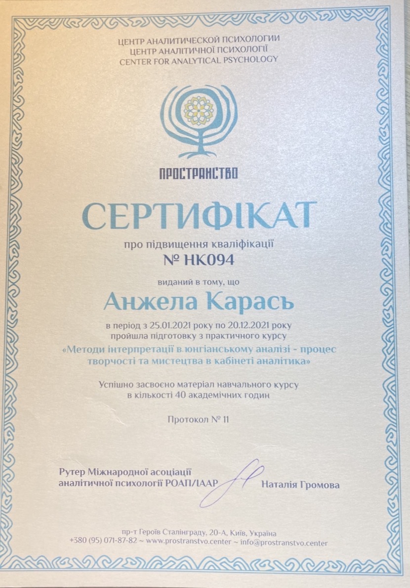 - Сертифікат підвищення кваліфікації«Методи інтерпретації в.юнгіанському аналізі - процес творчості та мистецтва в кабінеті аналітика» з 2022 року