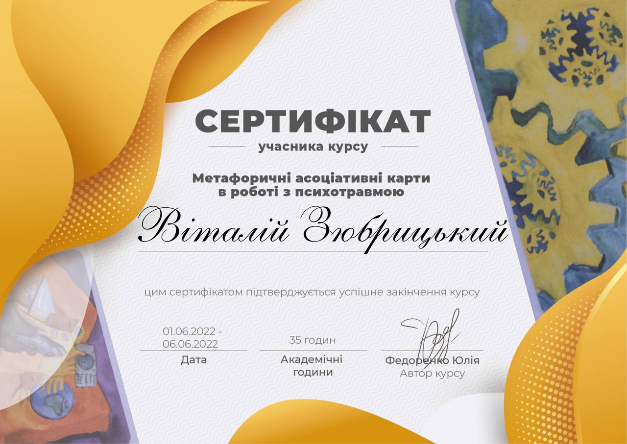 - Сертифікат Метафоричні асоціативні карти в роботі з психотравмою з 2022 року