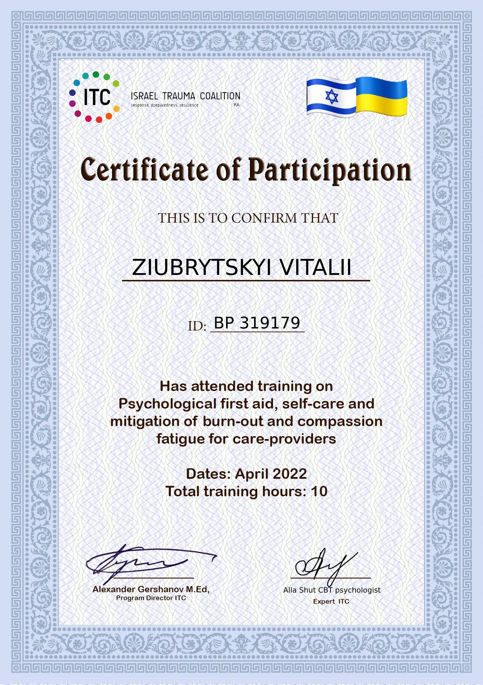 - Сертифікат Psychological first aid, self-care and mitigation of burn-out and compassion fatigue for care-providers з 2022 року