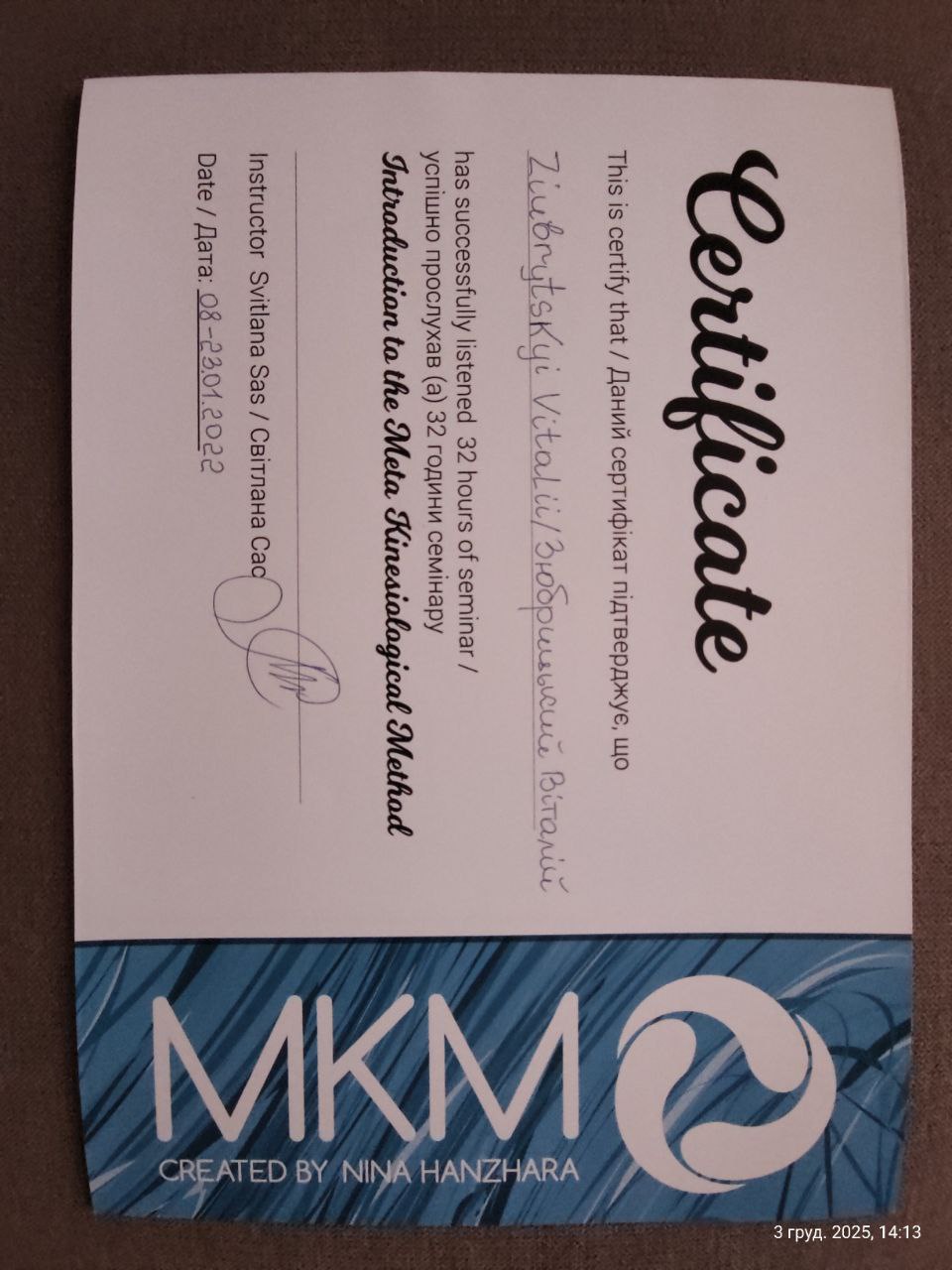 - Сертифікат Introduction to the Meta Kinesiological Method з 2022 року