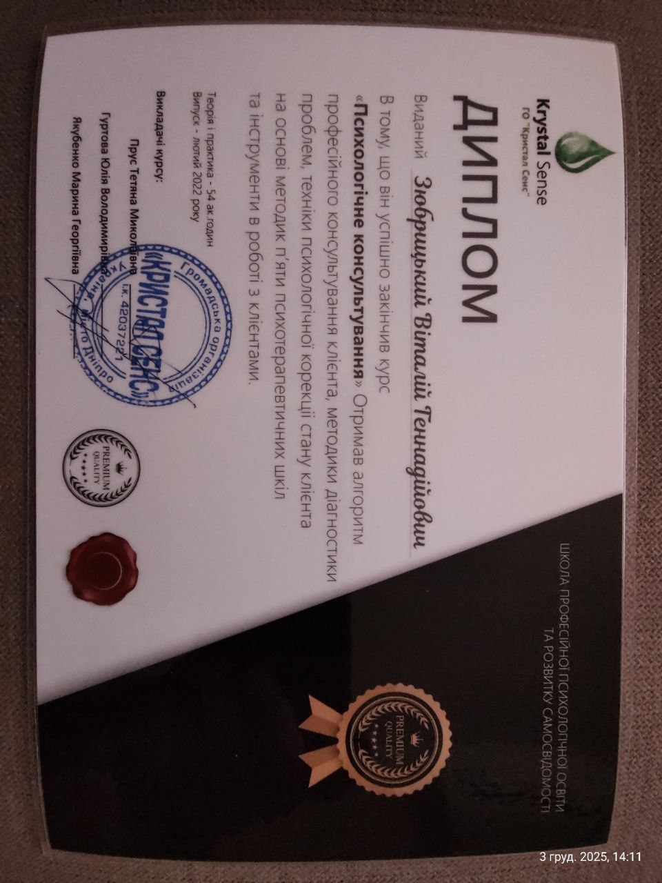 - Сертифікат Особливості роботи офіцера-психолога в умовах бойових дій з 2025 року