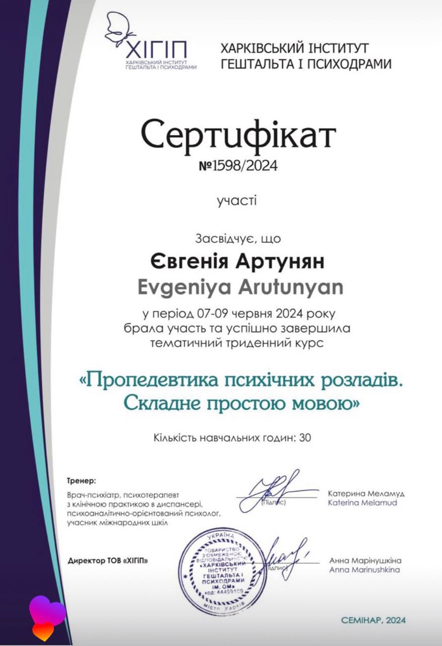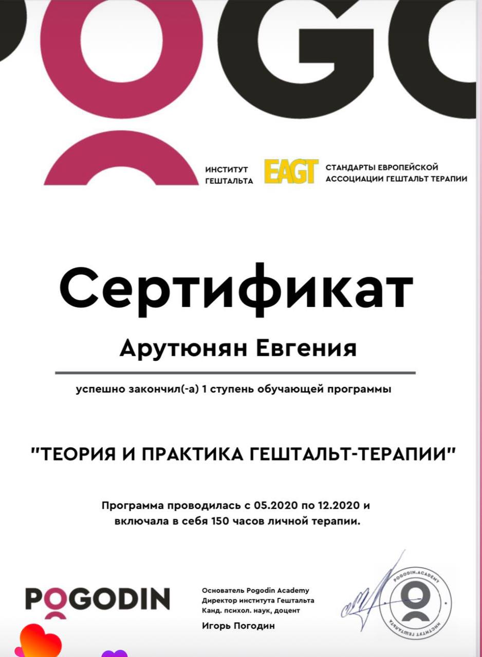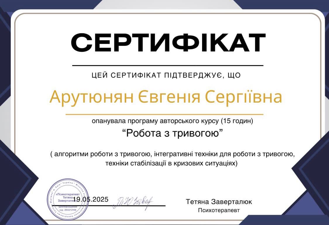 - Сертифікат Гештальт 1 ступінь з 2020 року