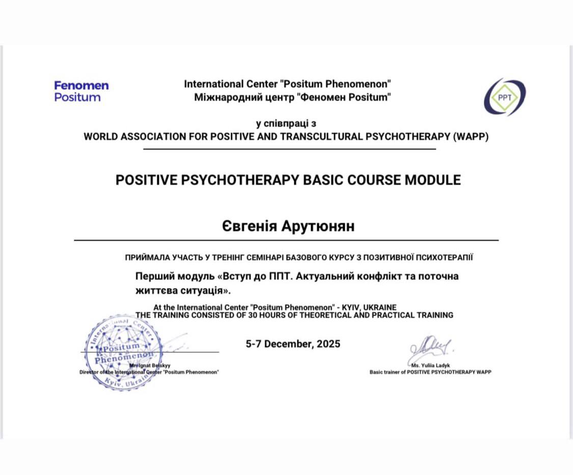 - Сертифікат Позитивна психотерапія Базовий курс з 2025 року