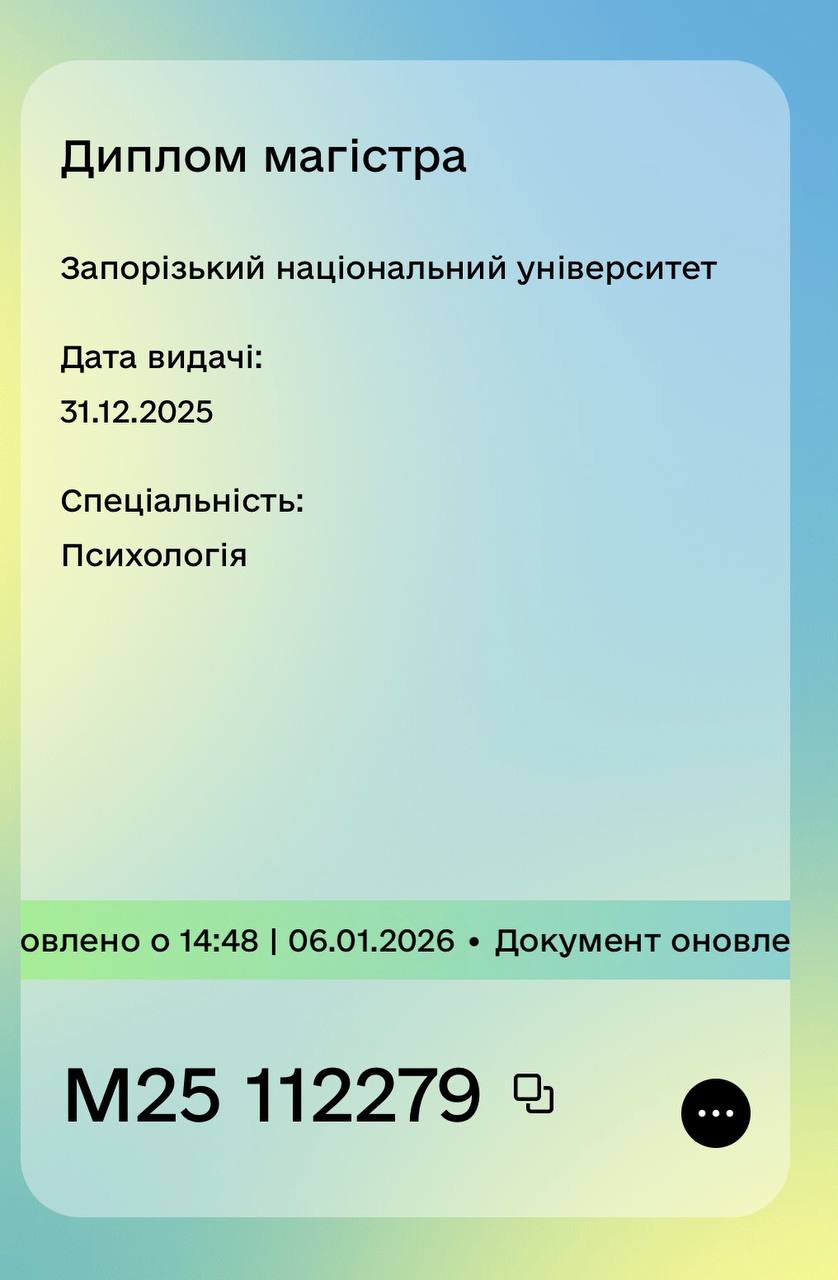 Я — практикуюча психологиня з досвідом роботи 2 роки. Працюю в підходах гештальт-терапії та позитивної психотерапії, поєднуючи увагу до емоційного досвіду людини з опорою на її ресурси та сильні сторони. Маю відповідну фахову підготовку в обраних напрямах та постійно підвищую професійну кваліфікацію.
