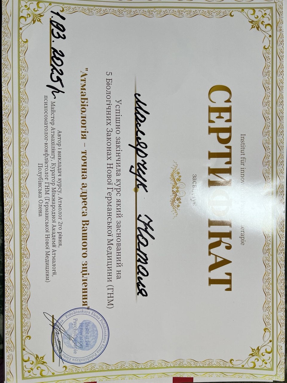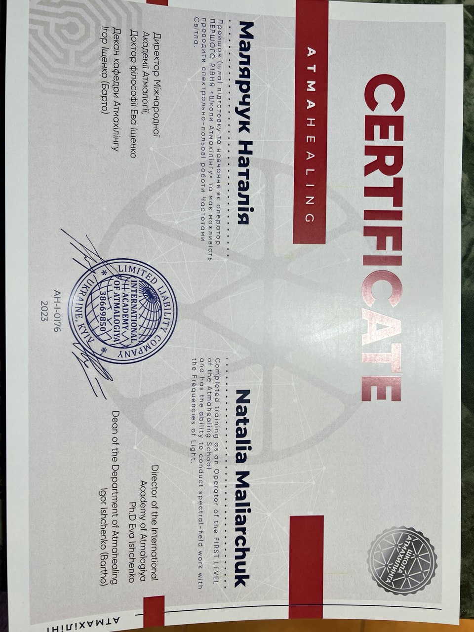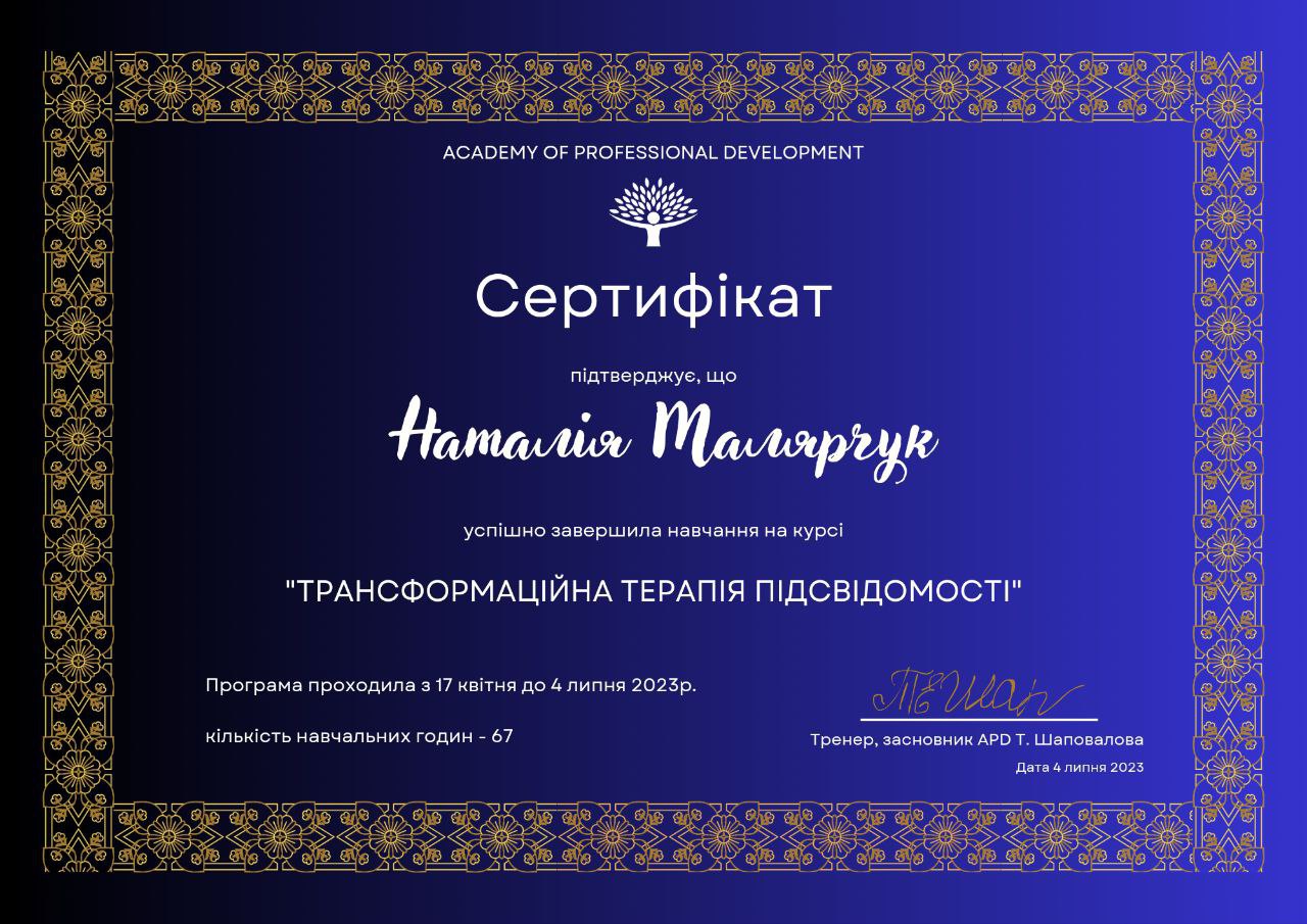 - Сертифікат Трансформаційна терапія підсвідомості з 2023 року