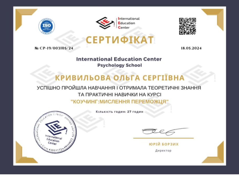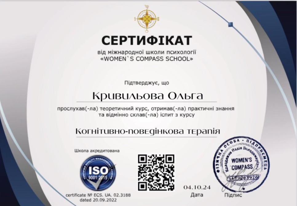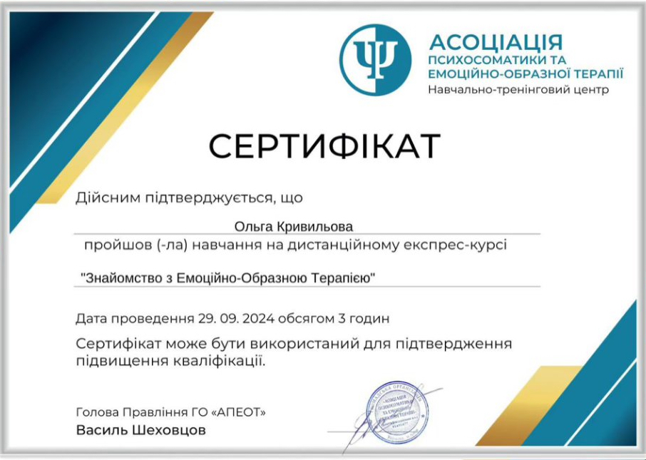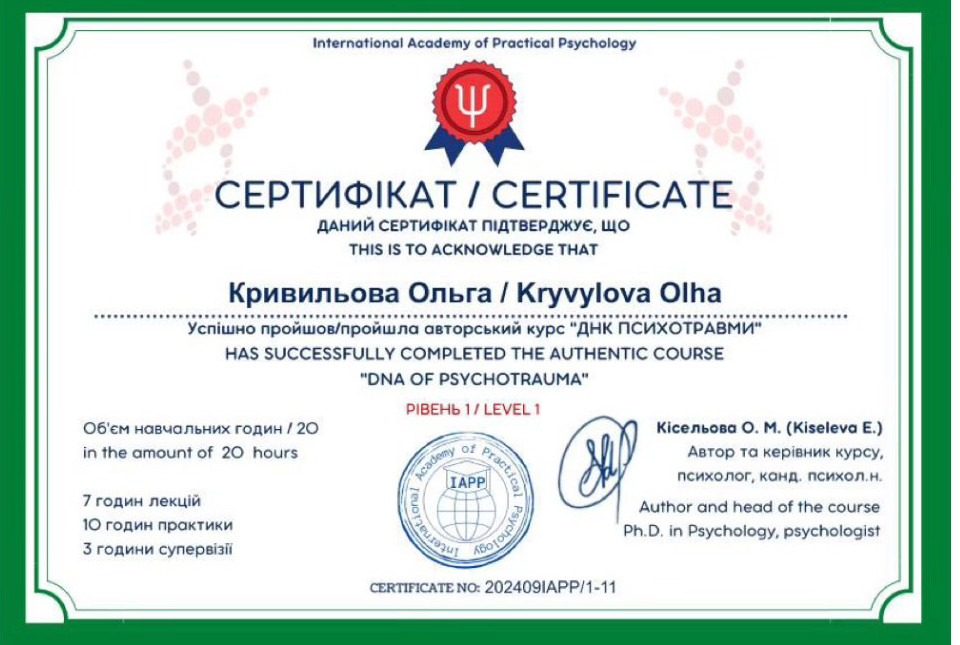 - Сертифікат WORLD ASSOCIATION FOR POSITIVE AND TRANSCULTURAL PSYCHOTHERAPY (WAPP) з 2025 року