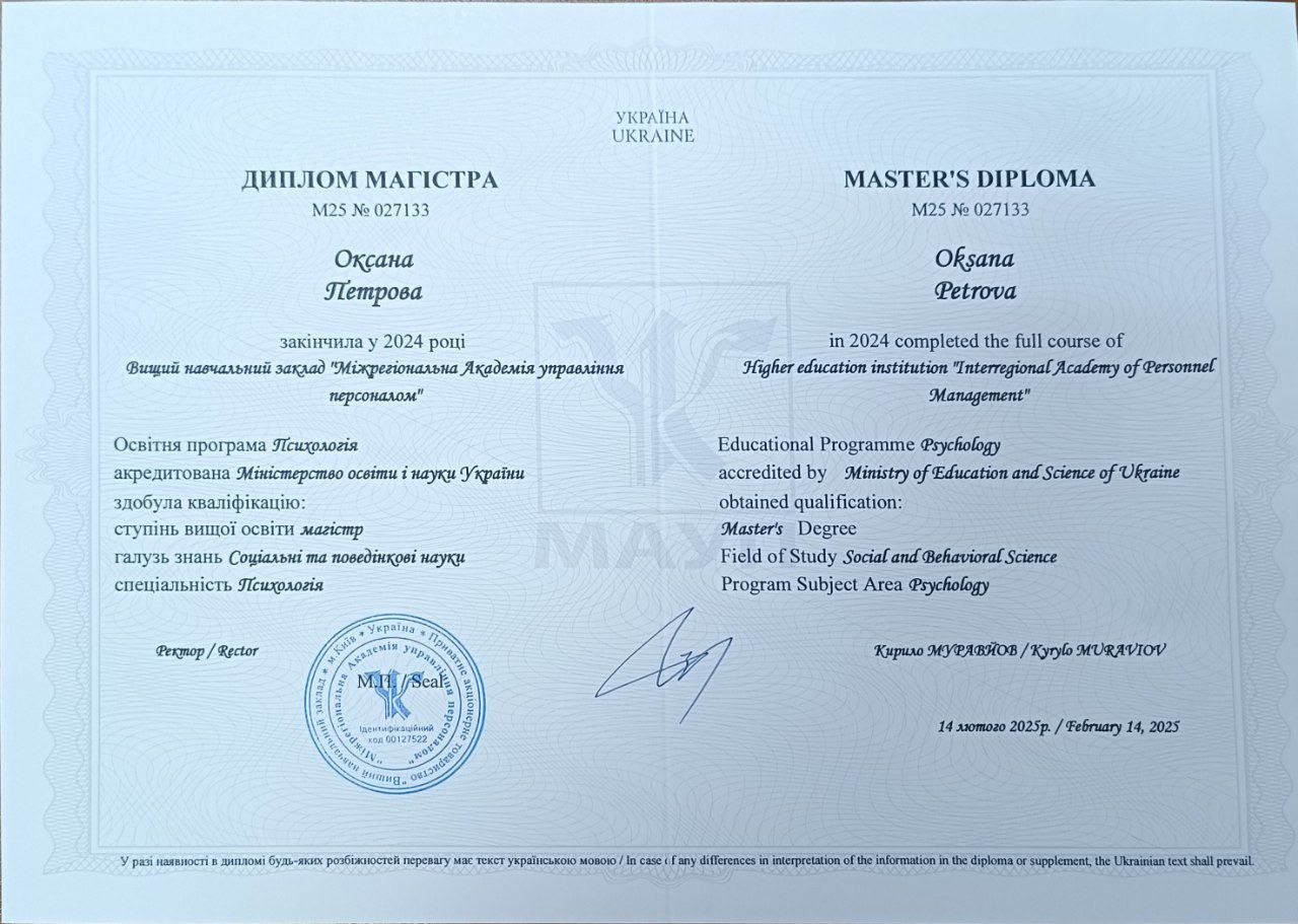 Я ціную контакт. Терапія тримається на людському контакті. Я уважно, бережливо і відкрито взаємодію з клієнтом, допомагаючи відчувати опору, ясність і цілісність у процесі змін.