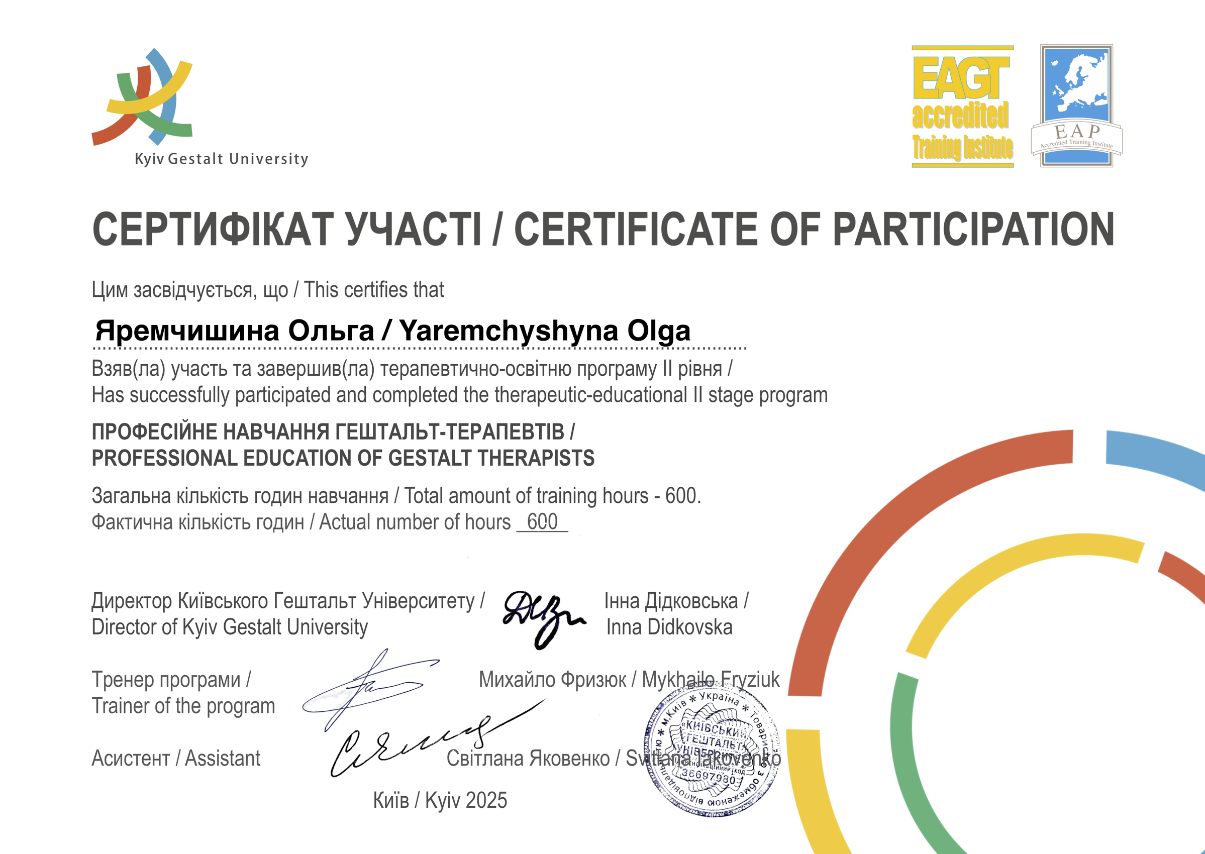 - Сертифікат Професійне навчання гештальт-терапевтів з 2025 року
