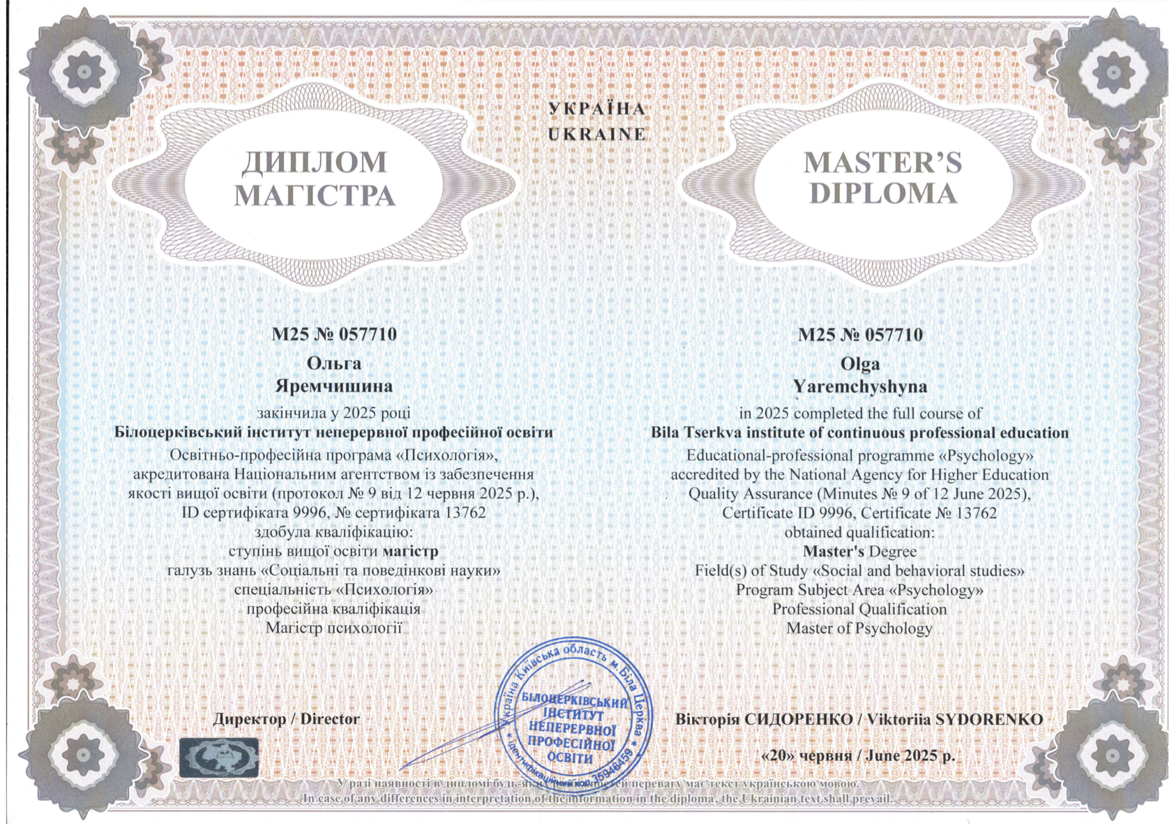 - Сертифікат Диплом про вищу психологічну освіту з 2025 року
