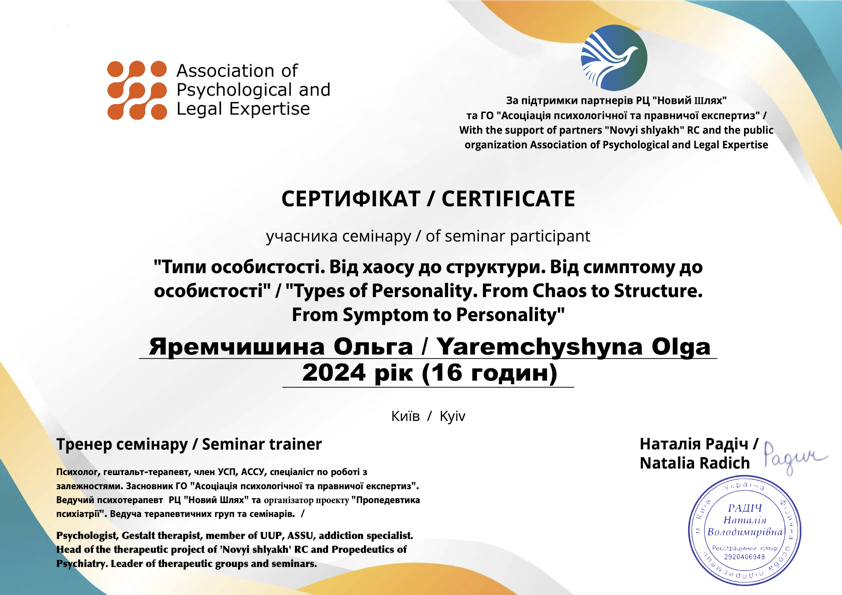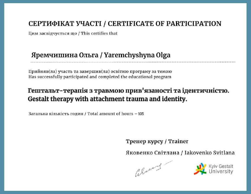 - Сертифікат Гештальт -терапія з травмою привʼязаності та ідентичністю з 2024 року