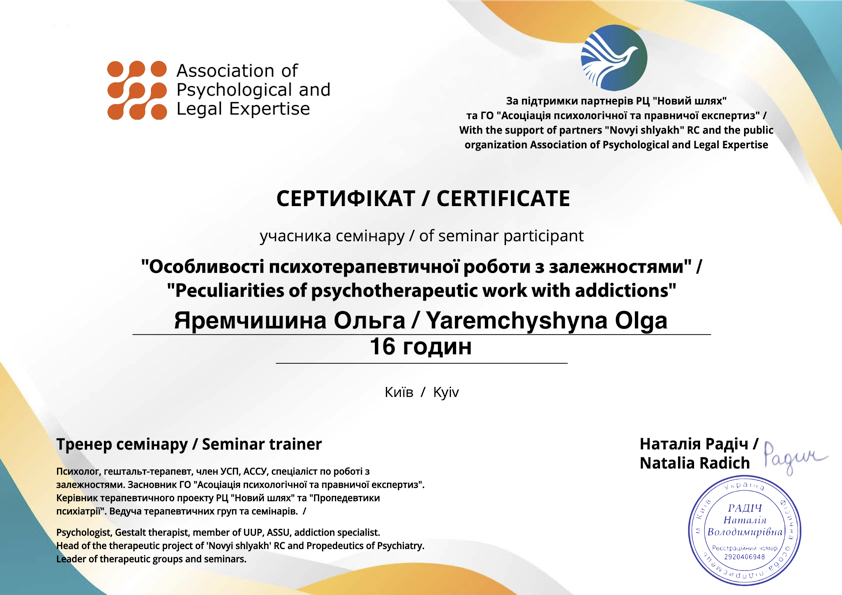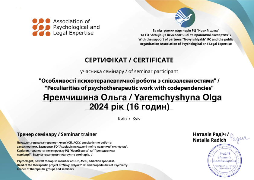 - Сертифікат Особливості психотерапевтичної роботи з залежностями та співзалежністю з 2023 року