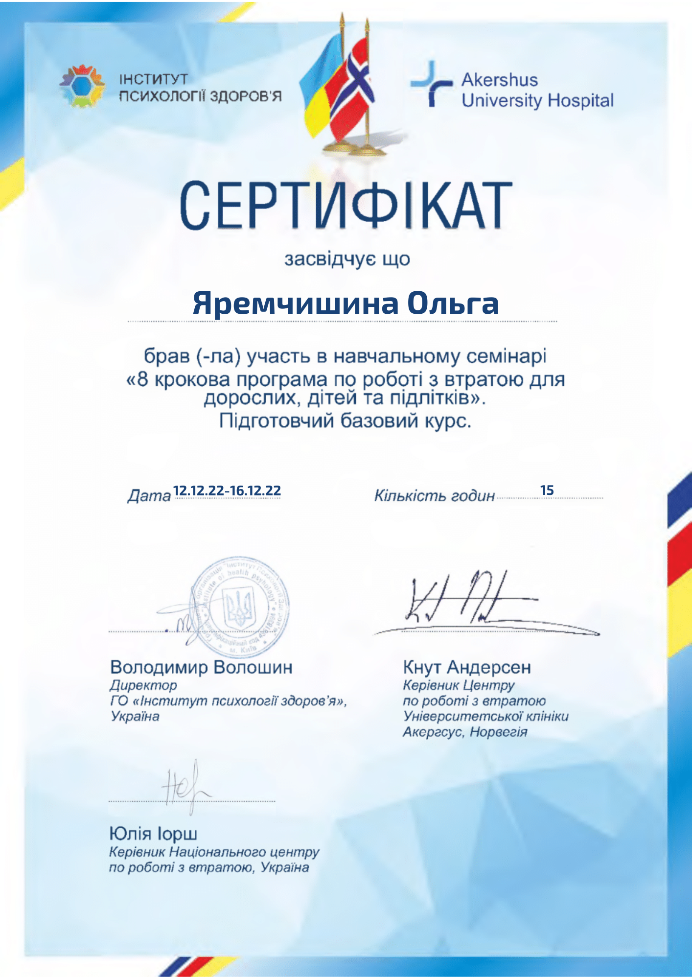 - Сертифікат 8-крокова програма по роботі з втратою з 2022 року