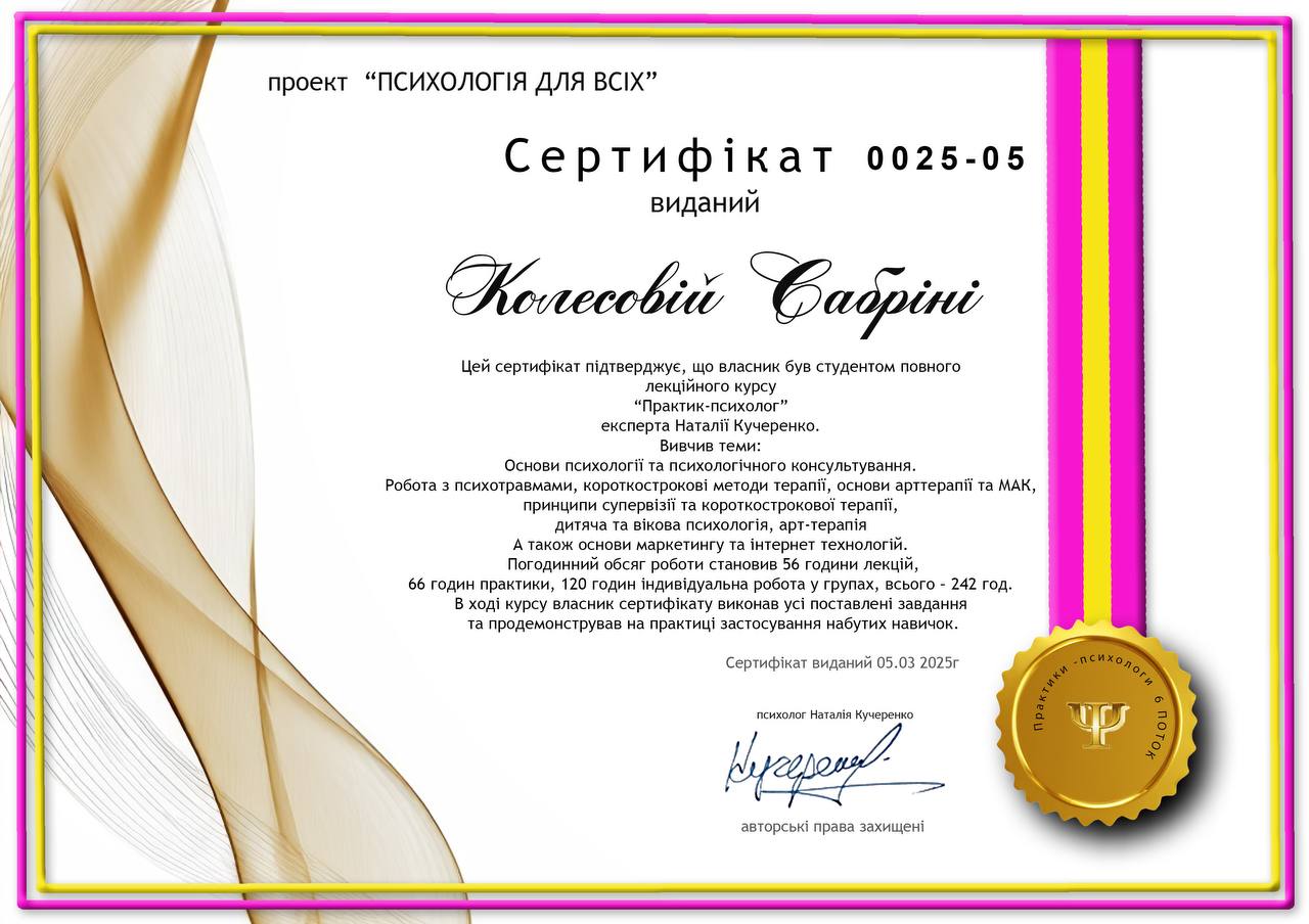- Сертифікат "Практик психолог" з 2025 року
