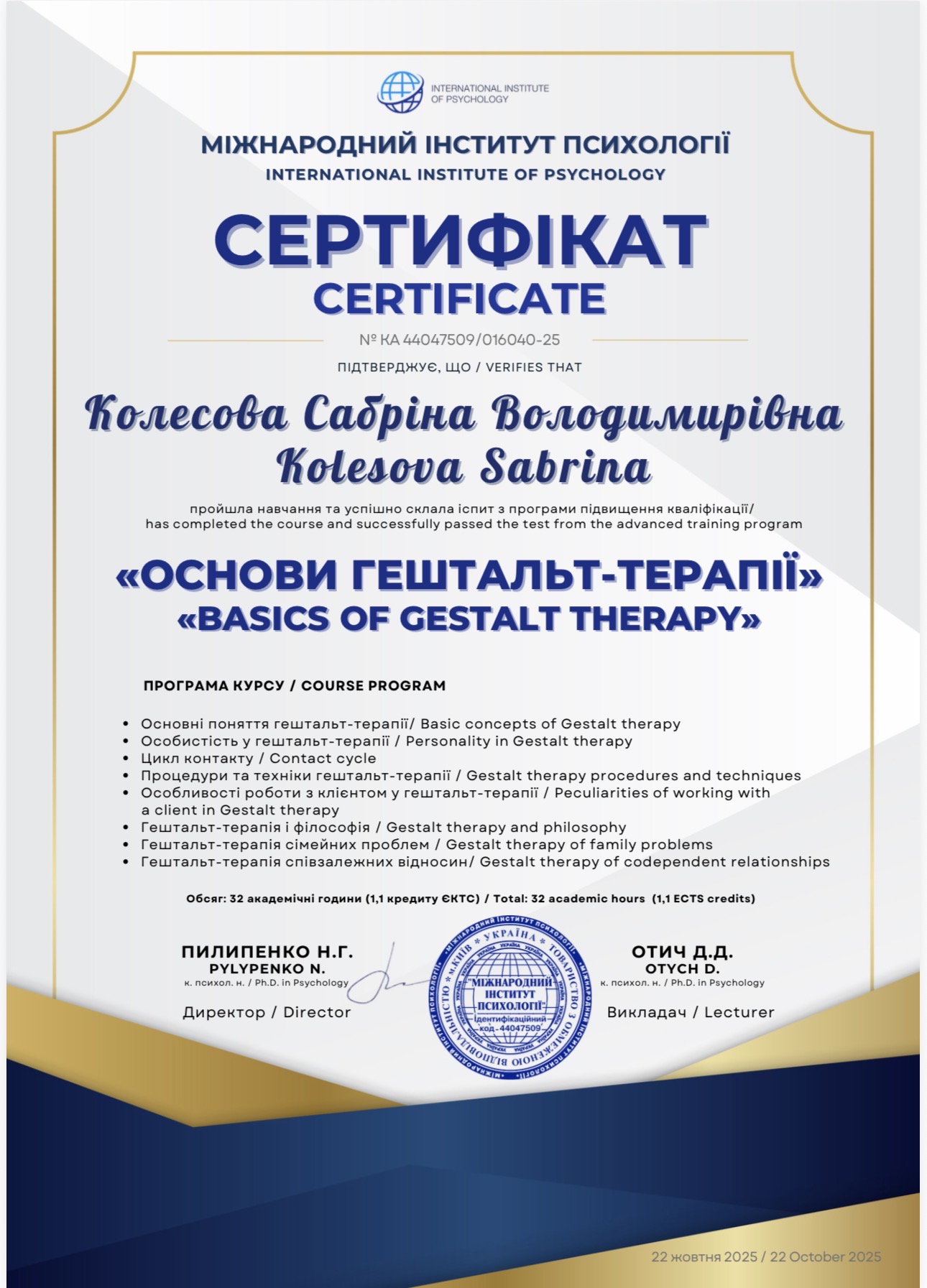 - Сертифікат "Основи гештальт-терапії" з 2025 року